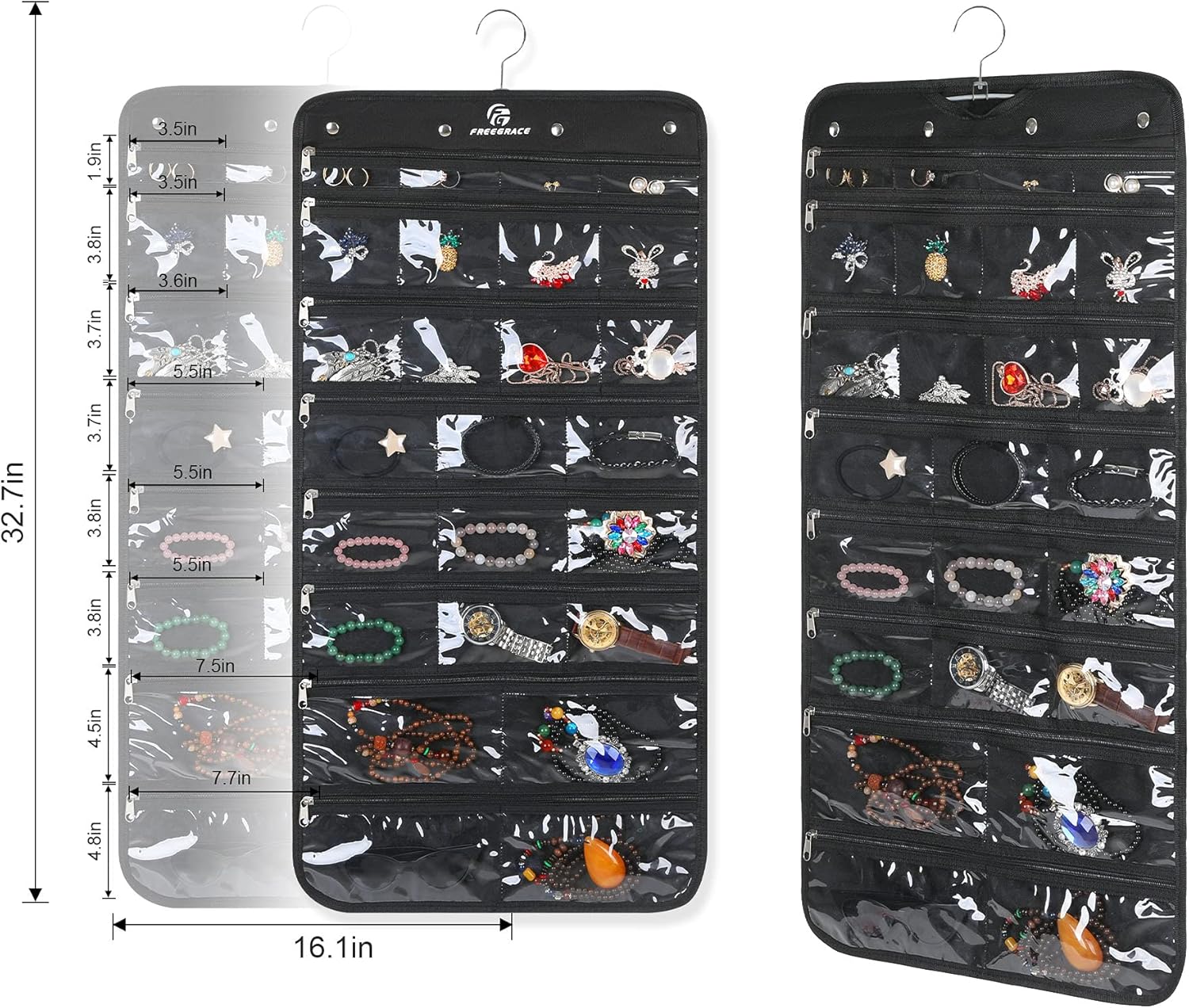 - QUALITY MATERIALS: Freegrace’s sturdy hanging jewelry organizer is made of 600D polyester Oxford fabric and has a PU backing (SIZE: 32.7’’ x 16.5’’). The pockets are made of transparent PVC to allow you to see through to the stored jewelry, and the zipper and revolving metal hanger are well-made and durable.