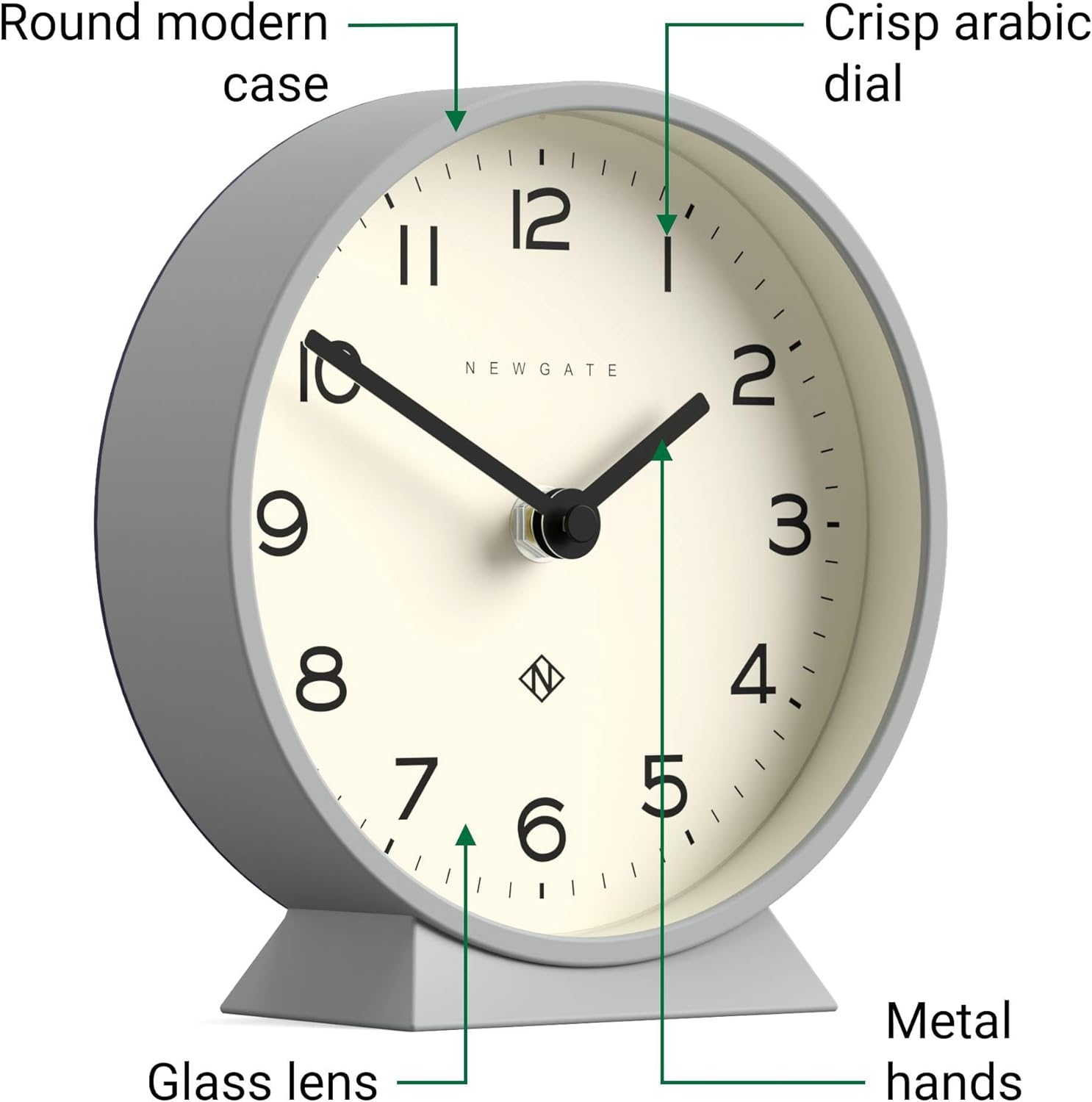 - Modern contemporary round desk clock with its clean, sculptural form and understated elegance, this Newgate clock offers a masterclass in minimalist design.