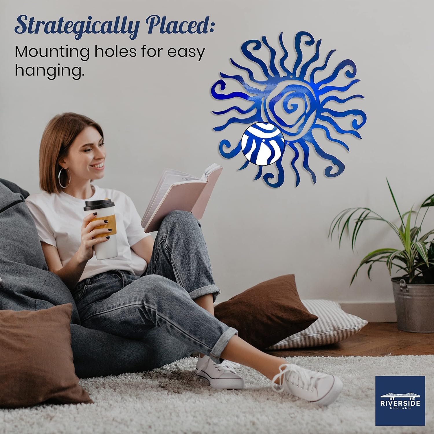 Riverside Designs Wacky Sun Metal Wall Art Indoor/Outdoor Decor - 12" Blue, Rust Proof Wall Sculpture - Made in USA - Ideal for Bedroom, Garden, Home, Patio and Farmhouse