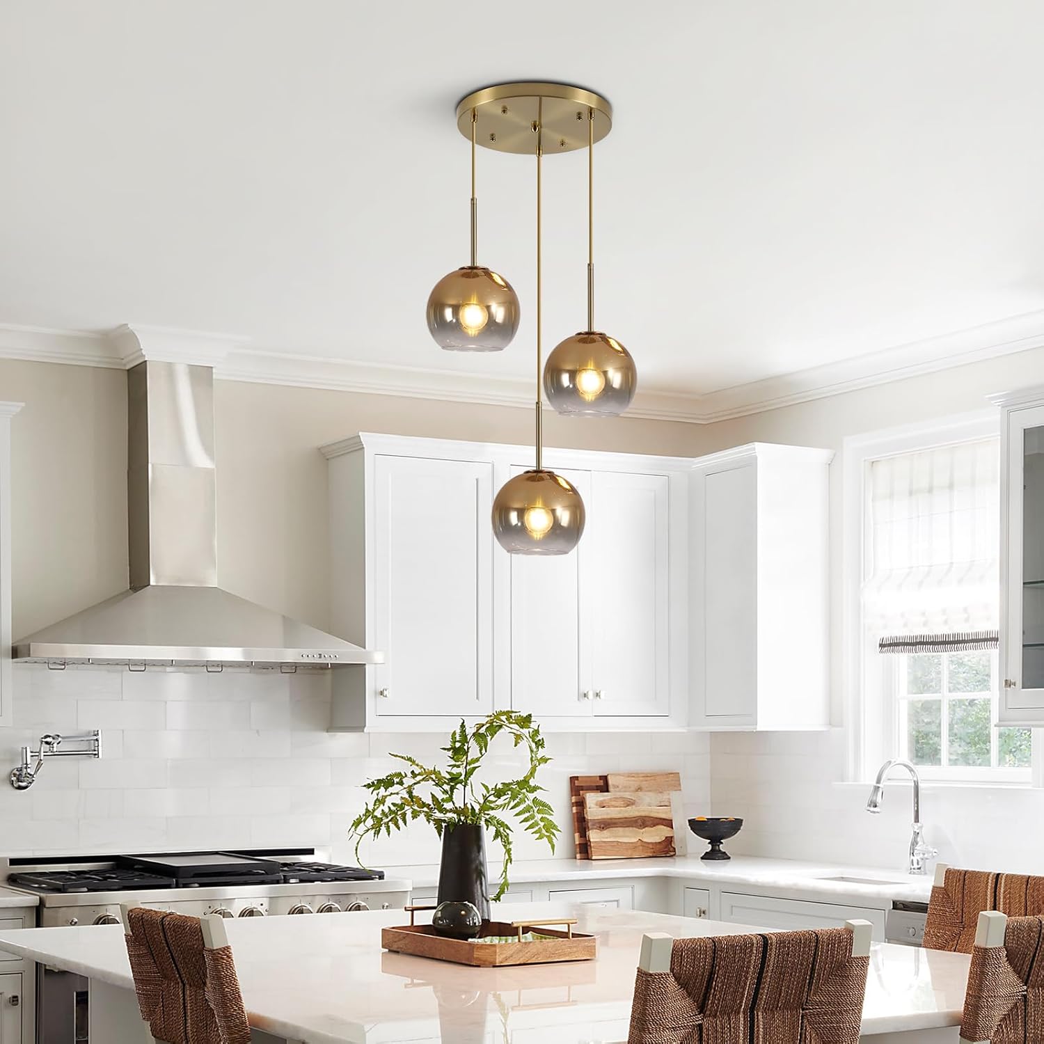 - Adjustable Cord: The gold 3 light cluster pendant lighting features three cables that are the same length, you can adjust the hanging height to achieve various arrangement layouts. If you need longer hanging cord, we could send you replacement. The large kitchen island pendant light can be installed on sloped, vaulted, slanted and flat ceiling