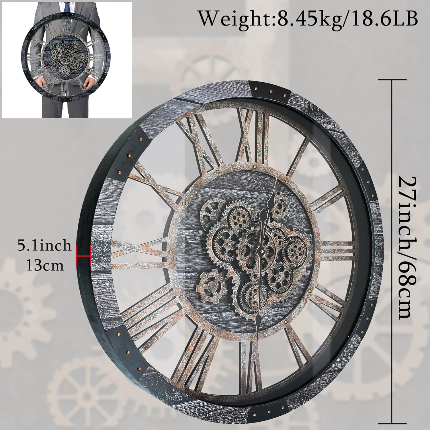 27 Inch Moving Gear Wall Clock, Oversized Wall Clocks, Clock Living Room Decor, Solid Wood Frame, Battery Operated, Large Wall Clock with Steampunk Industrial for Fireplace(Gray)
