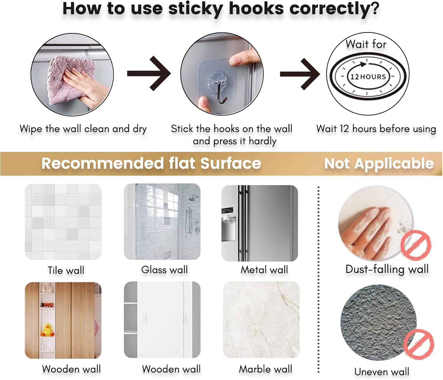 - ăHow to Useă1) Stick the hook on any smooth clean dry surface and press it tightly to remove any bubbles. 2) Wait 12 hours to adhere the hook firmly. 3) Finally, you can hang the hanging bag on the hook to enjoy it.