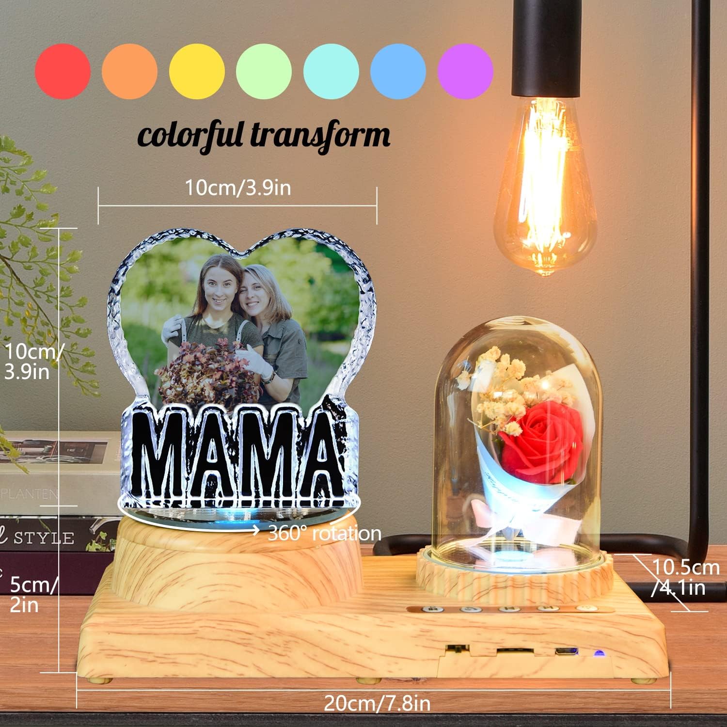 - ✔【High Quality Material】This bluetooth crystal ornament adopts high-quality white crystal to customize photos, wood grain rubber bluetooth music base can be connected to bluetooth or insert memory card to play music, with 7 color LED lights to switch freely, 360° rotation, USB charging. It is a very beautiful, romantic and interesting high-quality ornament.