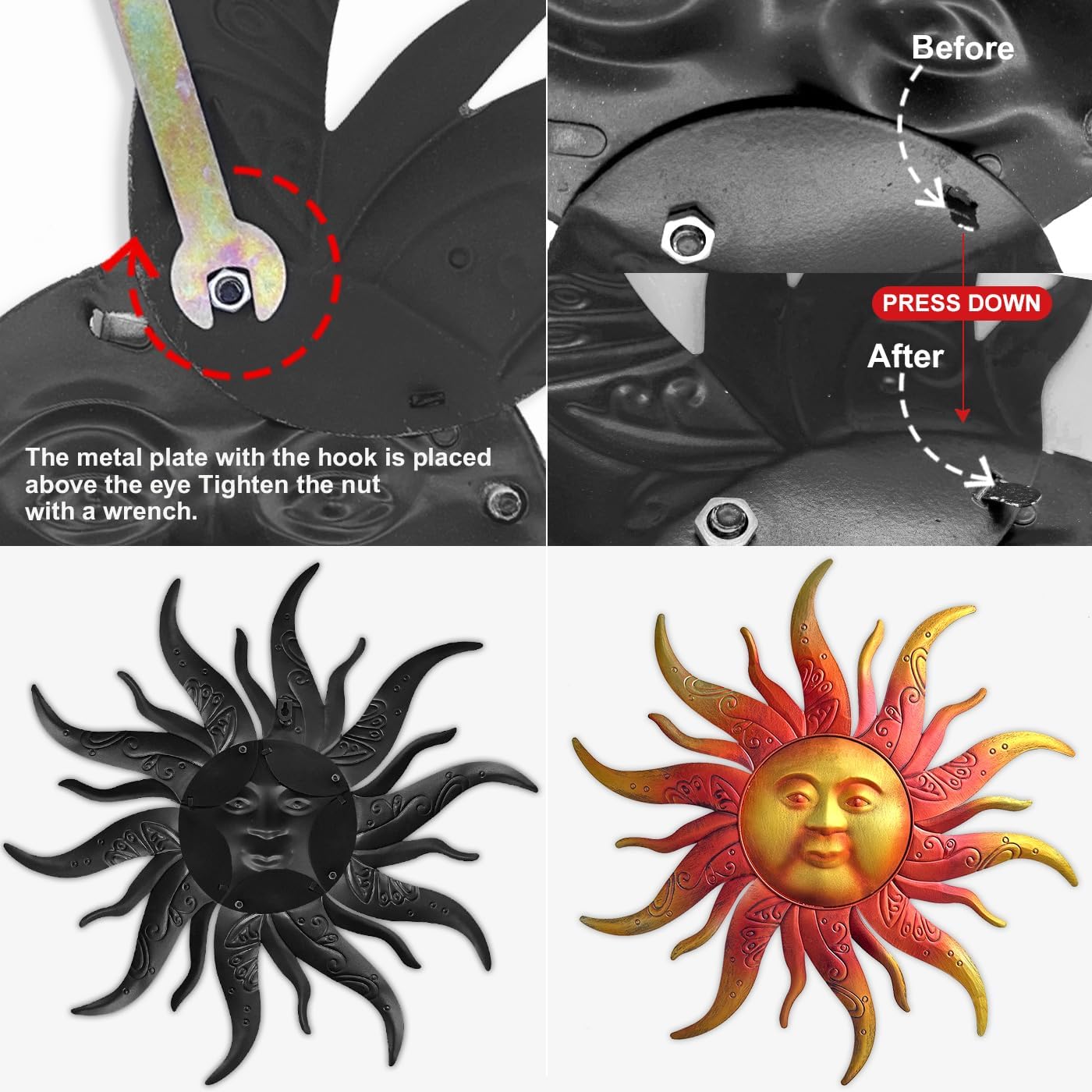 - Easy To Use: The sun you receive is unassembled, it takes you two minutes to assemble, the assembly process is very simple.There is a hook on the back of the metal sun, you can easily hang it on the wall or fence.