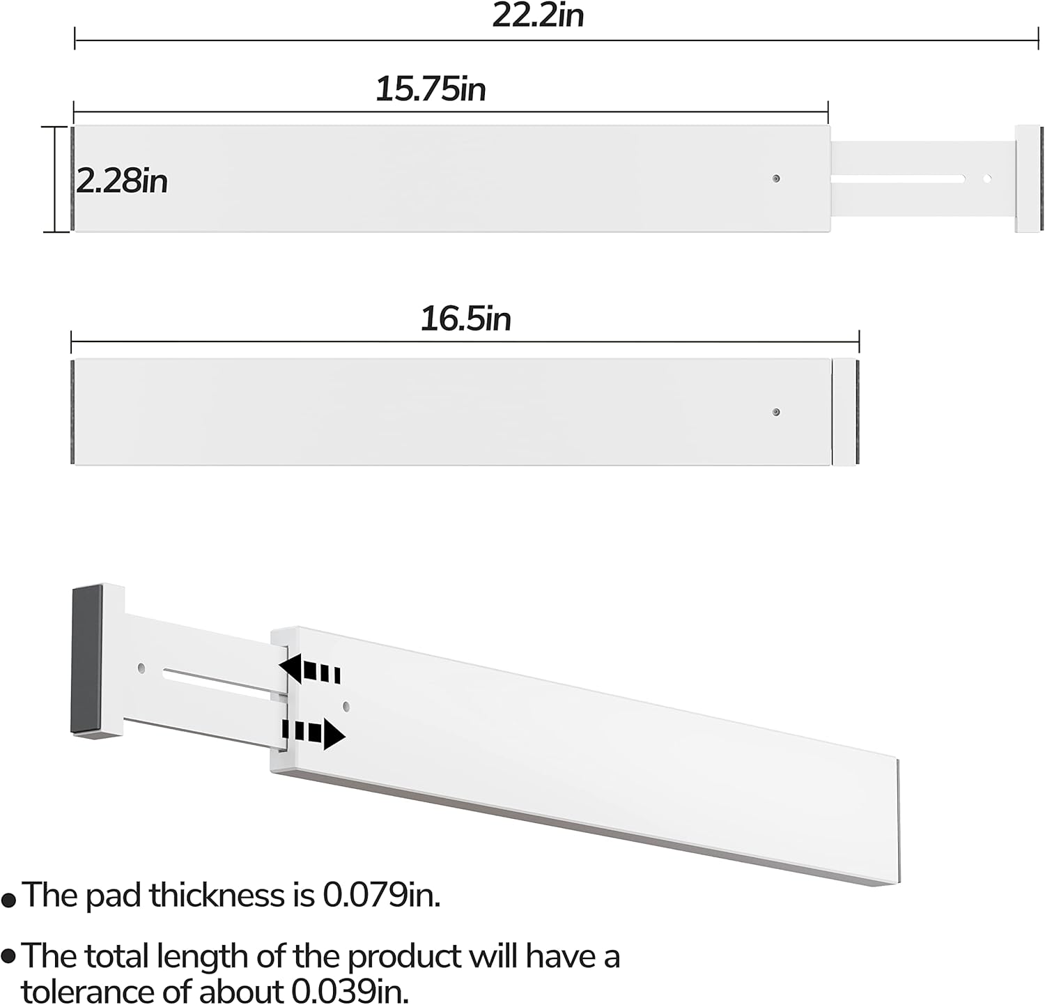 - EXPANDABLE: The size is 16.77 inch (un-expanded) to 22.05 inch (expanded); The pad thickness is 0.079 in, and the total length of the product will have a tolerance of about 0.039 in; Compressed packaging in transit may prevent the spring from being fully stretched to a sufficient length; At this time, please manually pull out the dividers to the top to ensure sufficient length