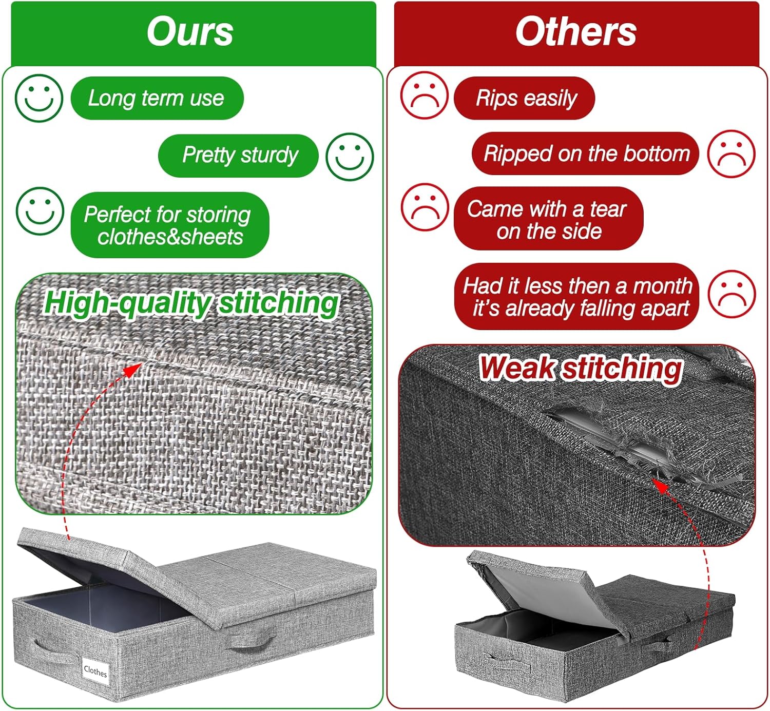 - STURDY STRUCTURE & DURABLE HANDLES: 3 Reinforced sewn-in handles make it easy maneuverability and convenient for you to carry and pull out from under the bed; handy bins make excellent underbed storage box; Lasts longer than under bed clothes storage organizer; Keep your bedroom neat and tidy with storage bins with lids that fit your room's existing decor and theme