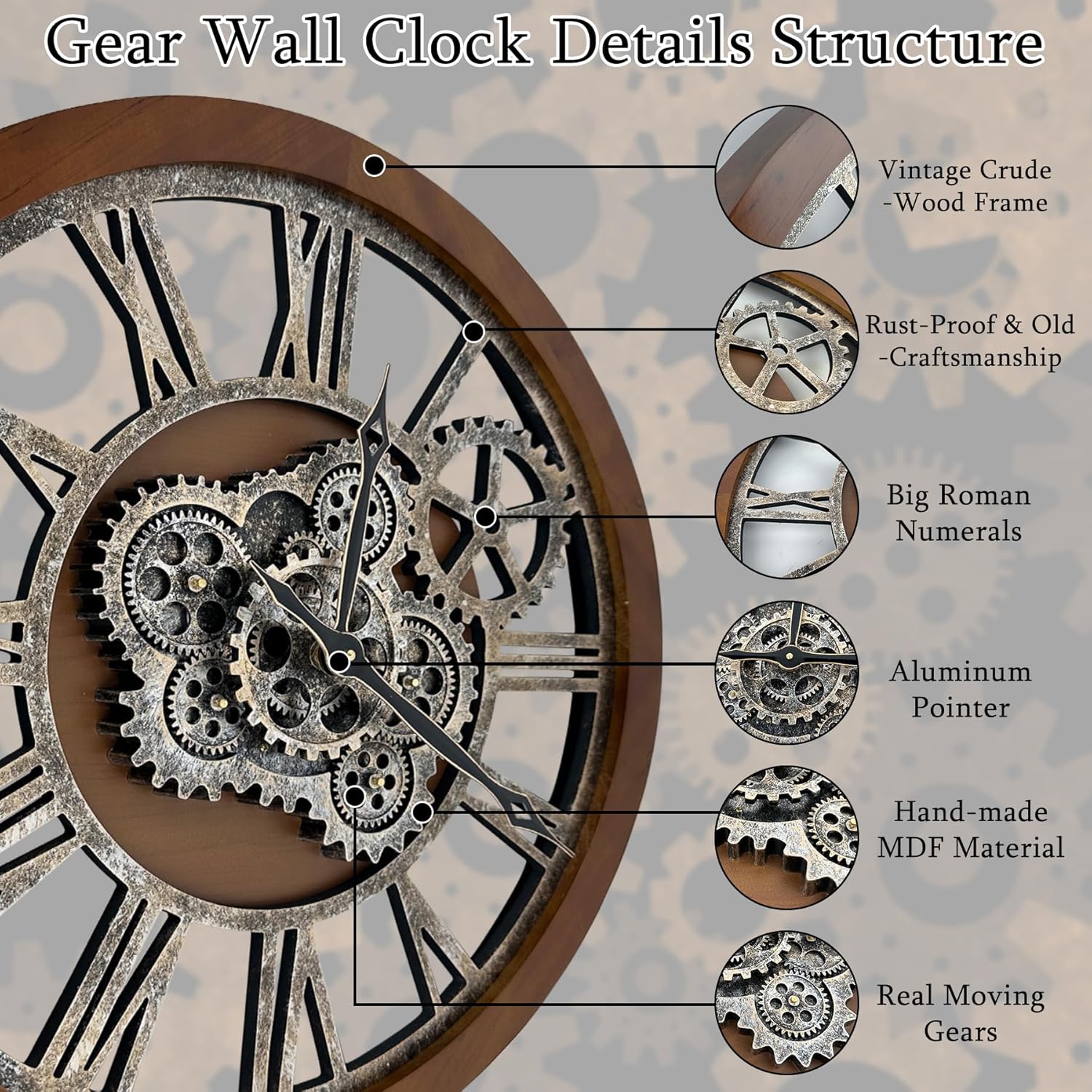 - ăReal Moving Gear ClockăAll gears for the wall clock are real moving! Design with rustic bronze-color and industrial style. An creative combination of four gears for a retro look, has a very exquisite decorative effect makes the wall clock become a chic art works. The large wall clock crafted of nature wood & MDF. Big roman numeral numbers and wood rustic moving gears perfect for any room decor.