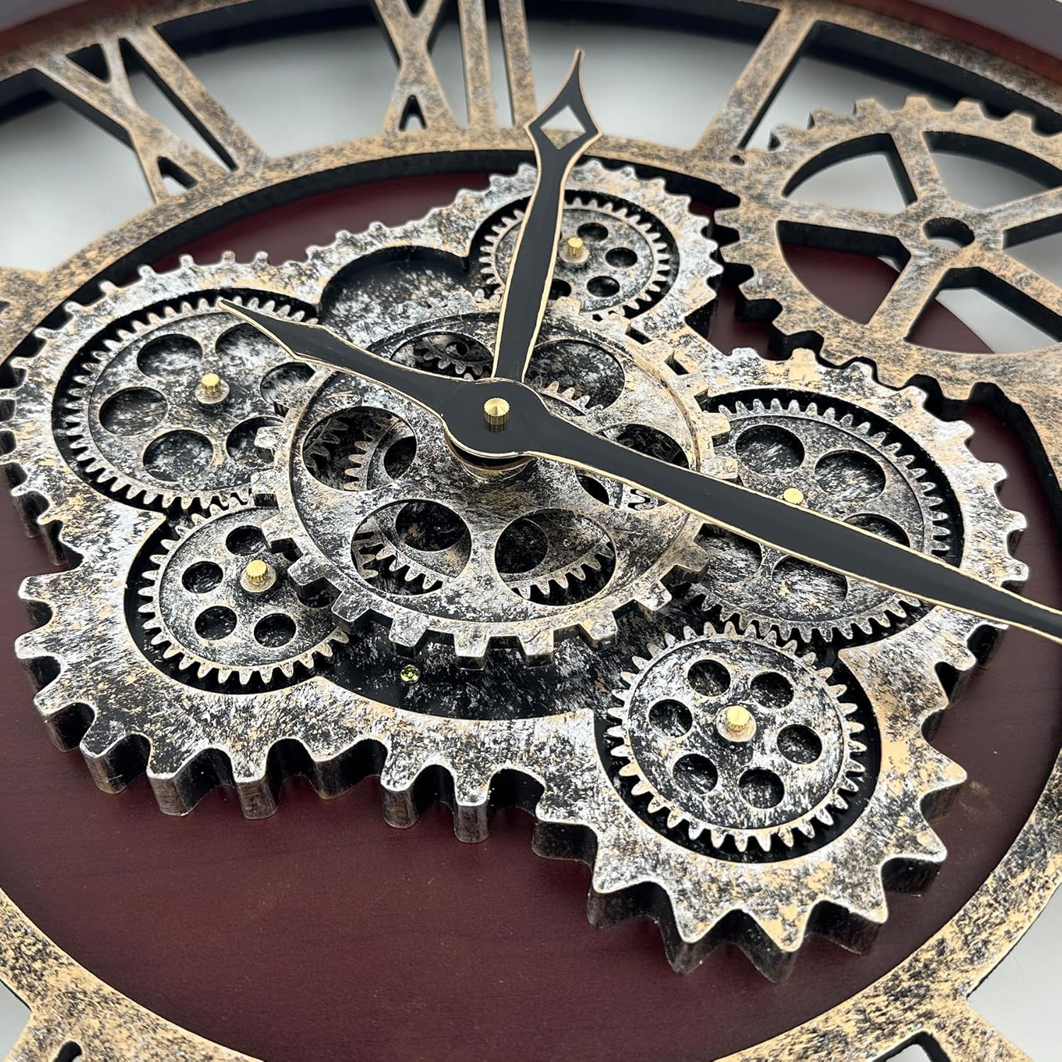 - ăReal Moving Gear ClockăAll gears for the wall clock are real moving! Design with rustic bronze-color and industrial style. An creative combination of four gears for a retro look, has a very exquisite decorative effect makes the wall clock become a chic art works. The large wall clock crafted of nature wood & MDF. Big roman numeral numbers and wood rustic moving gears perfect for any room decor.