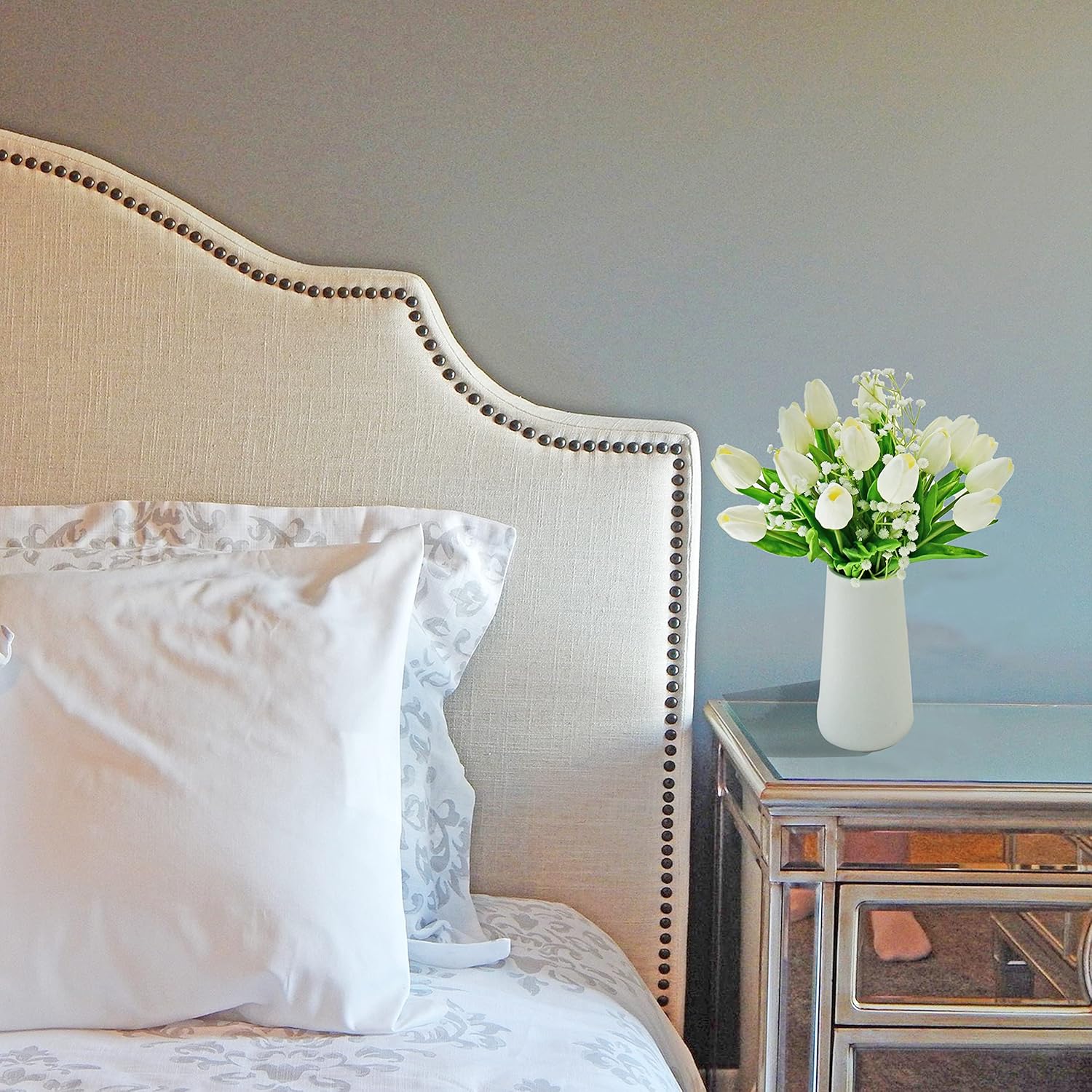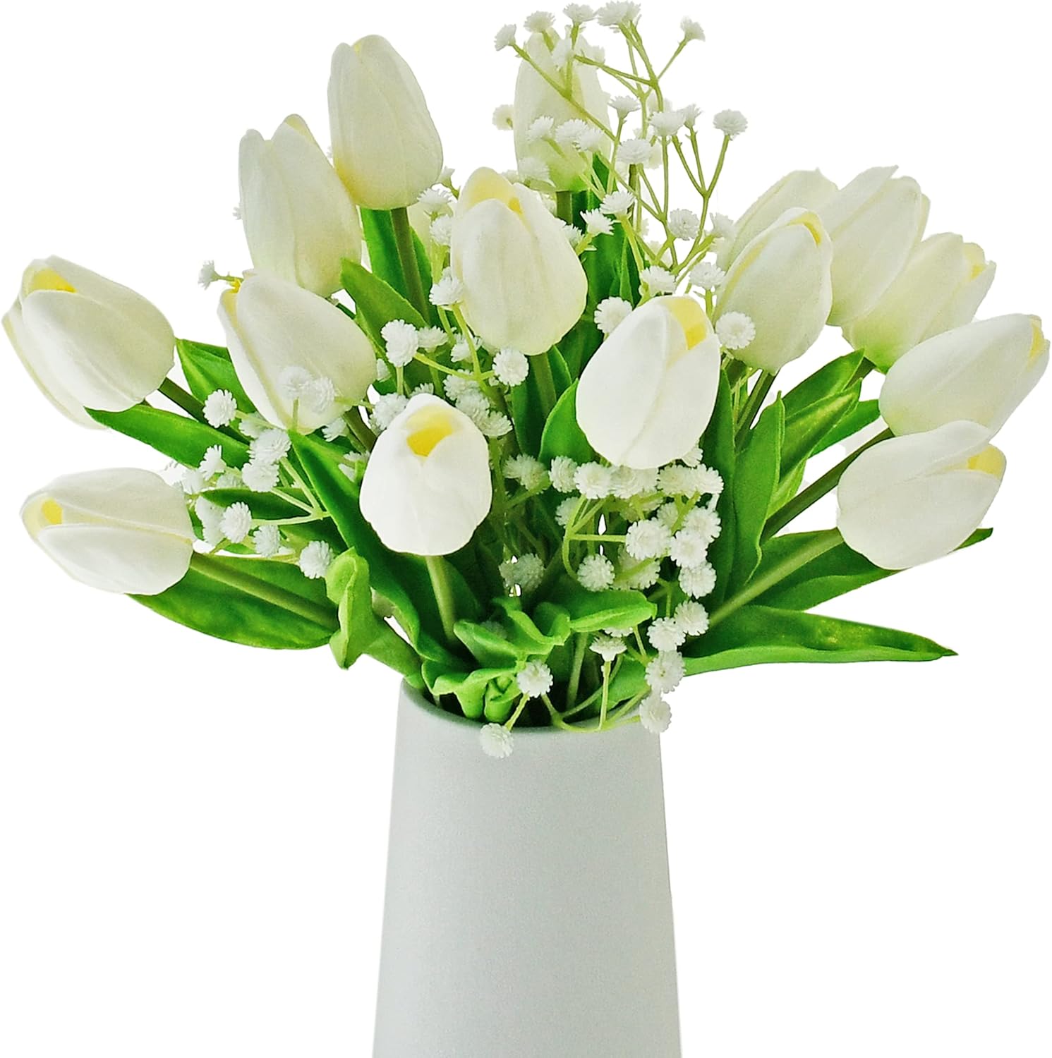 Mandy's Artificial Tulips 20 Stems White with 3pcs White Baby's Breath PU Faux Flowers for Wedding Home Decor 13.5 Inch