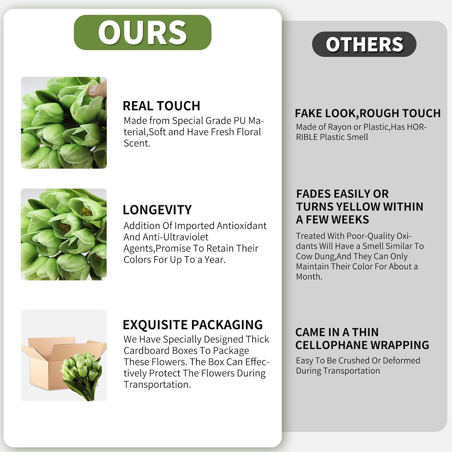 - High-Quality PU Material:Our artificial tulips are made of high-quality PU material,providing a soft touch just like real flowers,the realism is impressive. Completely eliminating the issue of plastic or chemical smells,making the flowers more environmentally friendly and harmless to the human body.