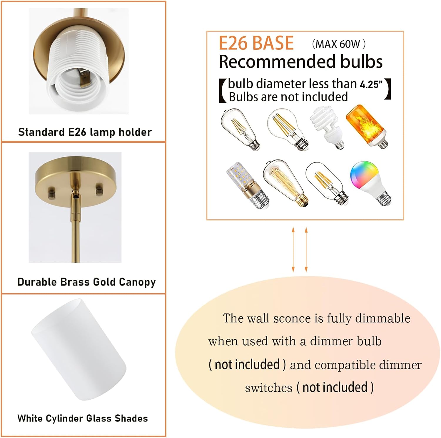 - 【Perfect Size & Specific Bulb Required】Mid Century cylinder Hanging Lighting size: 20'' L x 4.72'' W x 4.72'' H. Canopy diameter 4.72”Shade diameter 4.72”. The gold ceiling light compatibles with any LED, CFL and halogen or other E26 base bulbs (Max 60W, Bulb NOT Included). It is fully dimmable when used with a dimmer bulb and compatible dimmer switches(not included) to adjust the lighting effect to your needs.