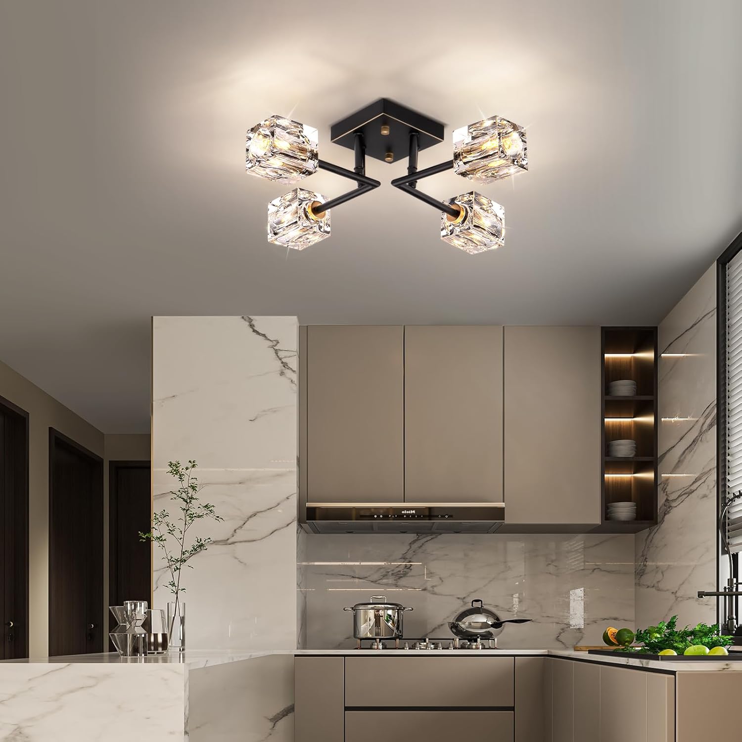 Modern Crystal Ceiling Light,Semi Flush Mount Ceiling Light Fixture with 4-Lights,Black and Gold Sputnik Chandeliers for Bedroom,Dining Room,Farmhouse Kitchen,Office,Entryway Hallway