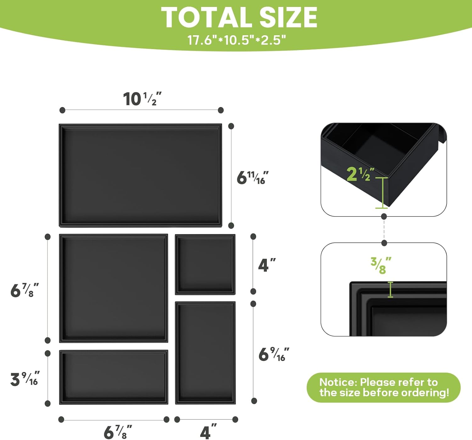 - 2.5" High Bathroom Drawer Organizer Trays: Greatseas bathroom drawer organizer trays provide ample space for storing items such as makeup, lotion, facial cleanser, perfume, and toiletries. The deep compartments ensure that your belongings remain secure, whether on a countertop or in a drawer