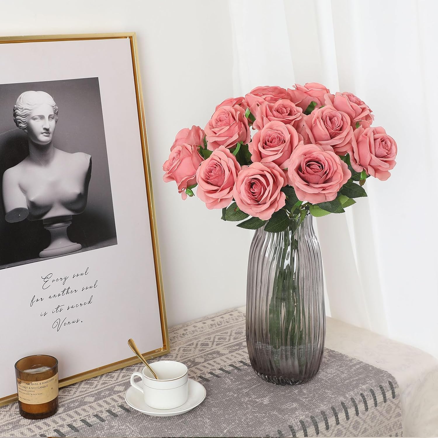 - Premium Quality Fake Roses: Rose flower head made of silk.Metal wire as skeleton,wrapped by plastic,can be cut or bent.Single stem pink silk roses have silky( real touch ) flowers and (high realistic) leaves.It's classic design and Multiple color choices can meet your demands in all seasons