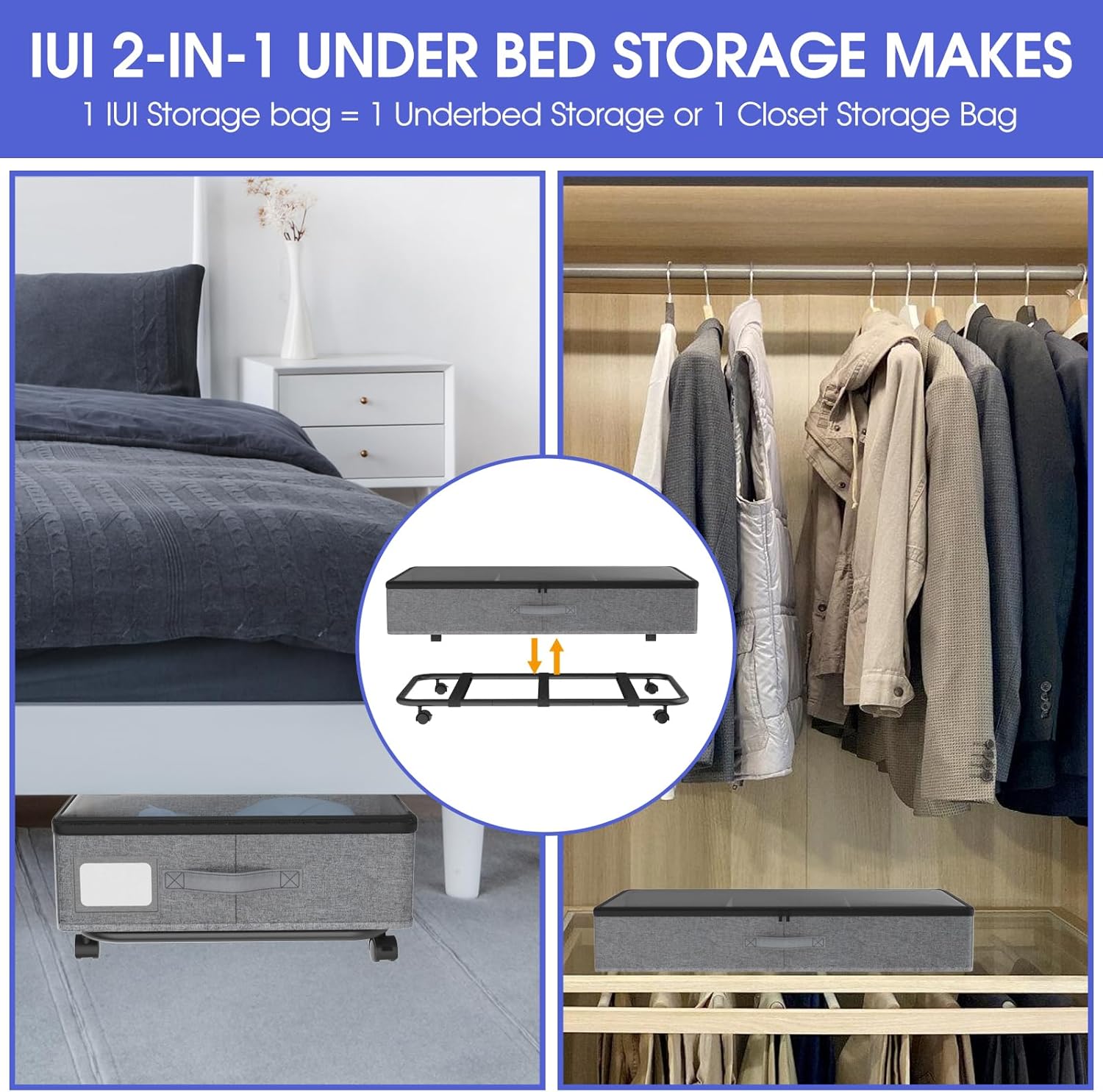 IUI Under Bed Storage with Wheels, 50L Capacity Under Bed Storage Containers, Under Bed Clothes Storage Containers with Clear Lid, Under Bed Storage Bins for Clothes,Shoes,Books,Toys,Gray,2 Pack