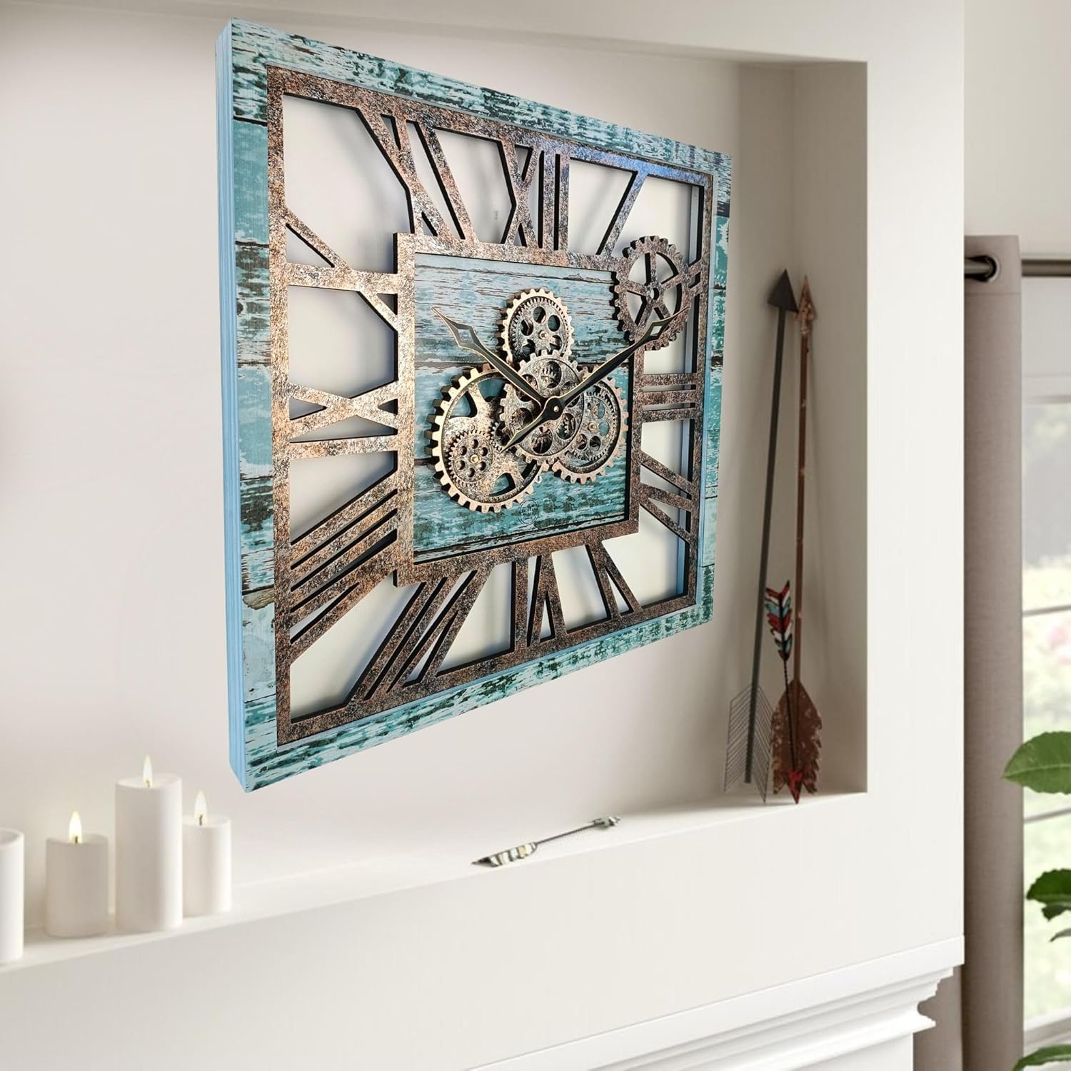 The Gears Clock 24'' Inch Square Real Moving Gear Wall Clock Vintage Industrial Oversized Rustic Farmhouse (Aqua Green)
