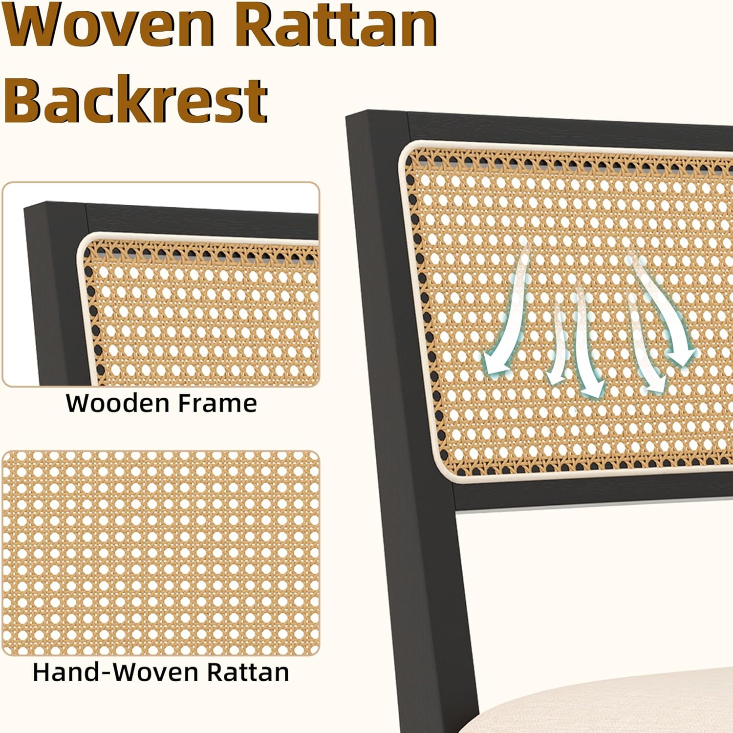 - ăBreathable Rattan BackăHand-woven with a natural open-weave design, our chairs feature a rattan back that promotes excellent airflow. This makes them exceptionally comfortable, particularly in warmer climates. The inherent flexibility of rattan adds a gentle give, further enhancing the seating comfort.