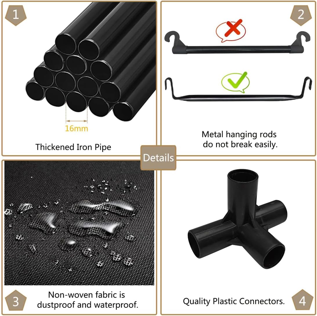 - 【Sturdy And Durable】The frame of the entire portable wardrobe is made of reinforced and thickened iron pipes, which are very strong and durable. The plastic connector is reinforced and not easy to break. So this cloth wardrobe will meet your long-term storage needs.