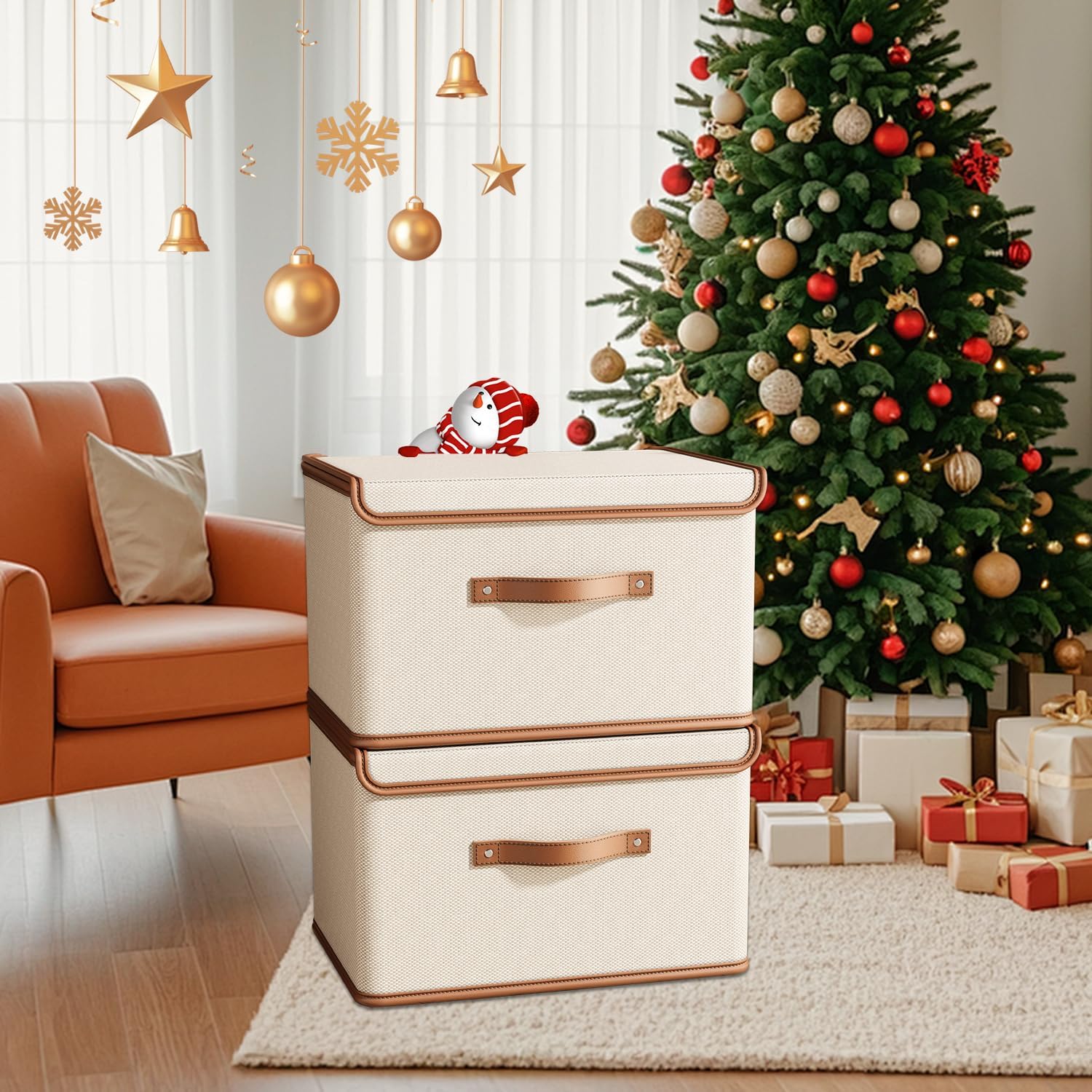 Tuza 2 Pack Storage Bins with Lids, Collapsible Closet Organizer Container, Fabric Organizer Box with Handles, Decorative Storage Boxes with Lids for Organizing Clothes, Books, File, White, Large