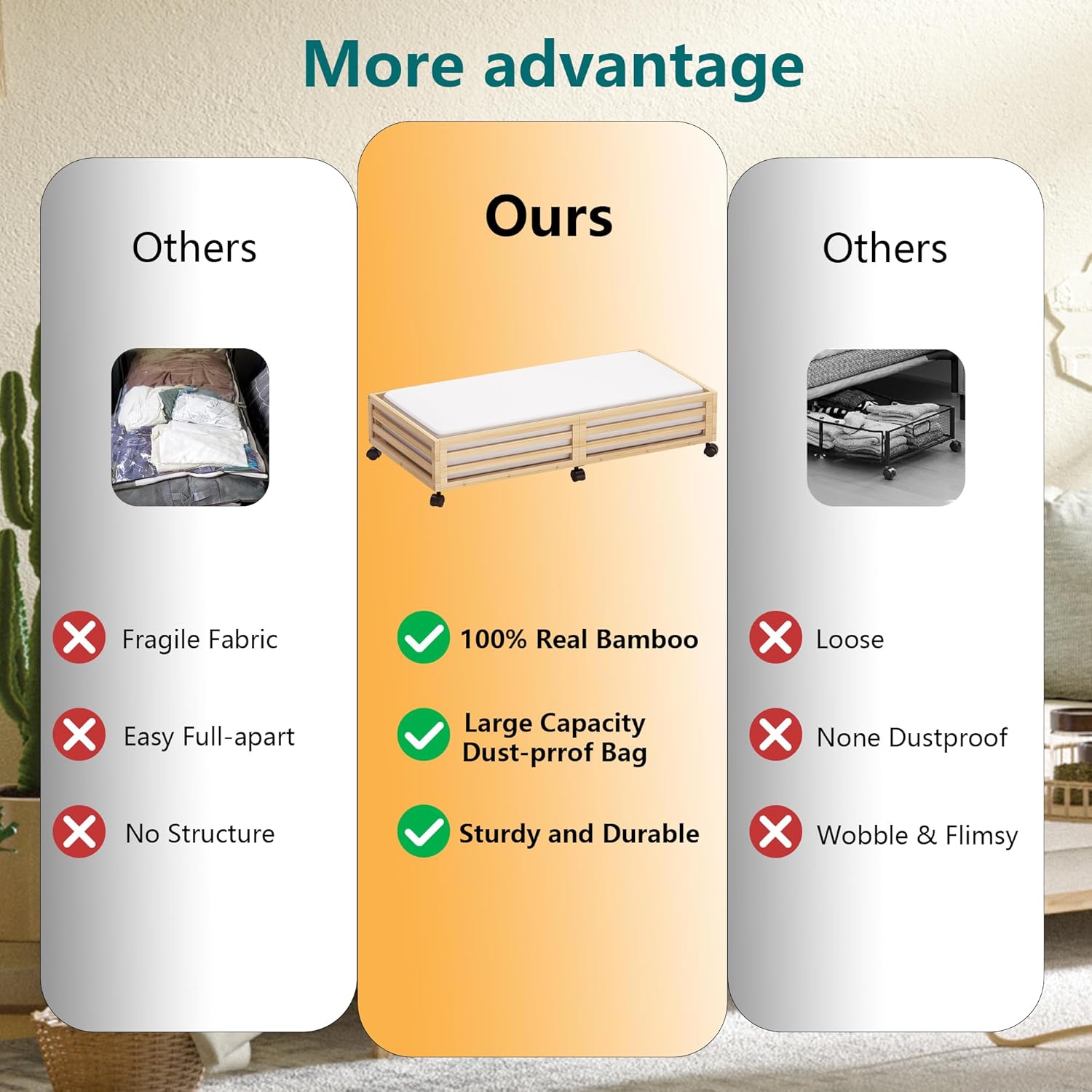 - π[Sturdy and Durable] Our under bed storage with wheels is crafted from premium wood bamboo, boasting 4 rotating wheels and a capacity of 120lbs. This 'under bed storage' solution includes non-woven bags for efficient organization of clothes, books, shoes, and toys.