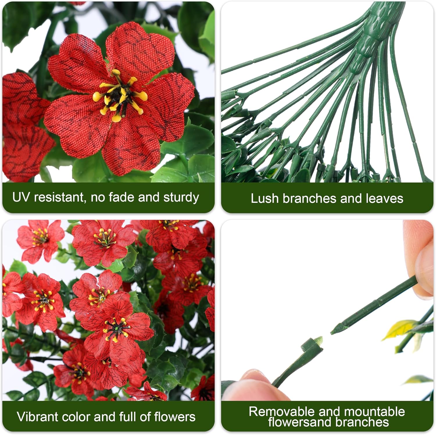 - Durable and UV Weather-Resistant: The fake hanging plants flowers are made of high quality silk cloth and plastic, UV and all weather resistant, waterproof and no fade in the sun and rainstorm.