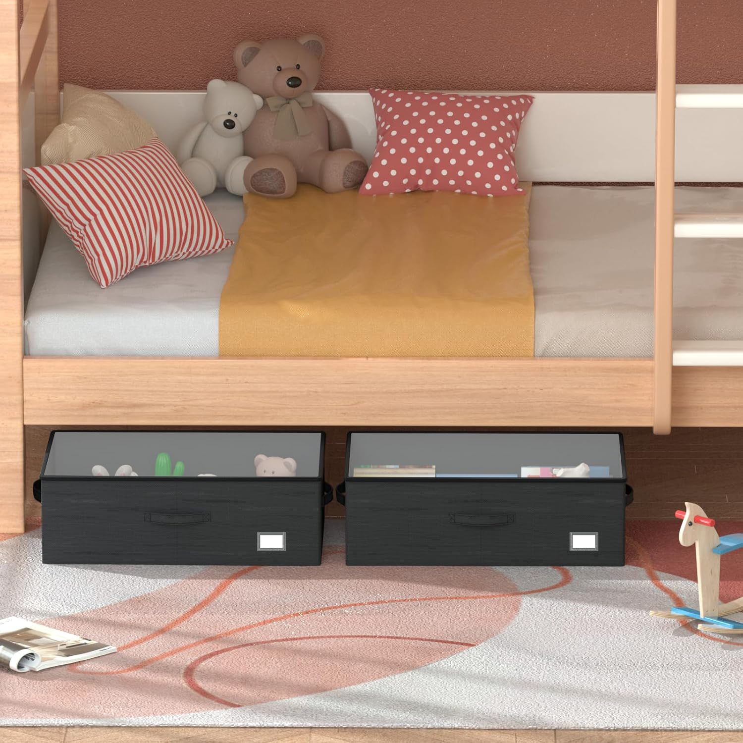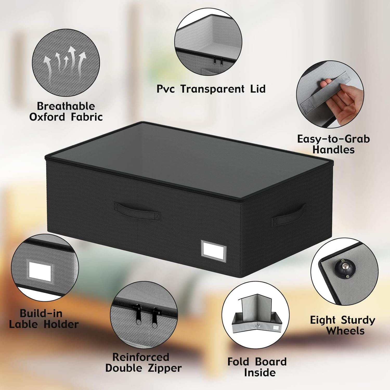 - [Strong Weight-Bearing Capability]: Made of durable oxford fabric, our underbed storage is built to withstand heavy weights. The bottom bracket is reinforced with hard wood, providing superior support compared to other elastic band structures. You can confidently store items weighing up to 40 pounds, such as books, However, when placing heavy objects above, please be careful to move slowly to prevent the wheels from being damaged by excessive lateral force!