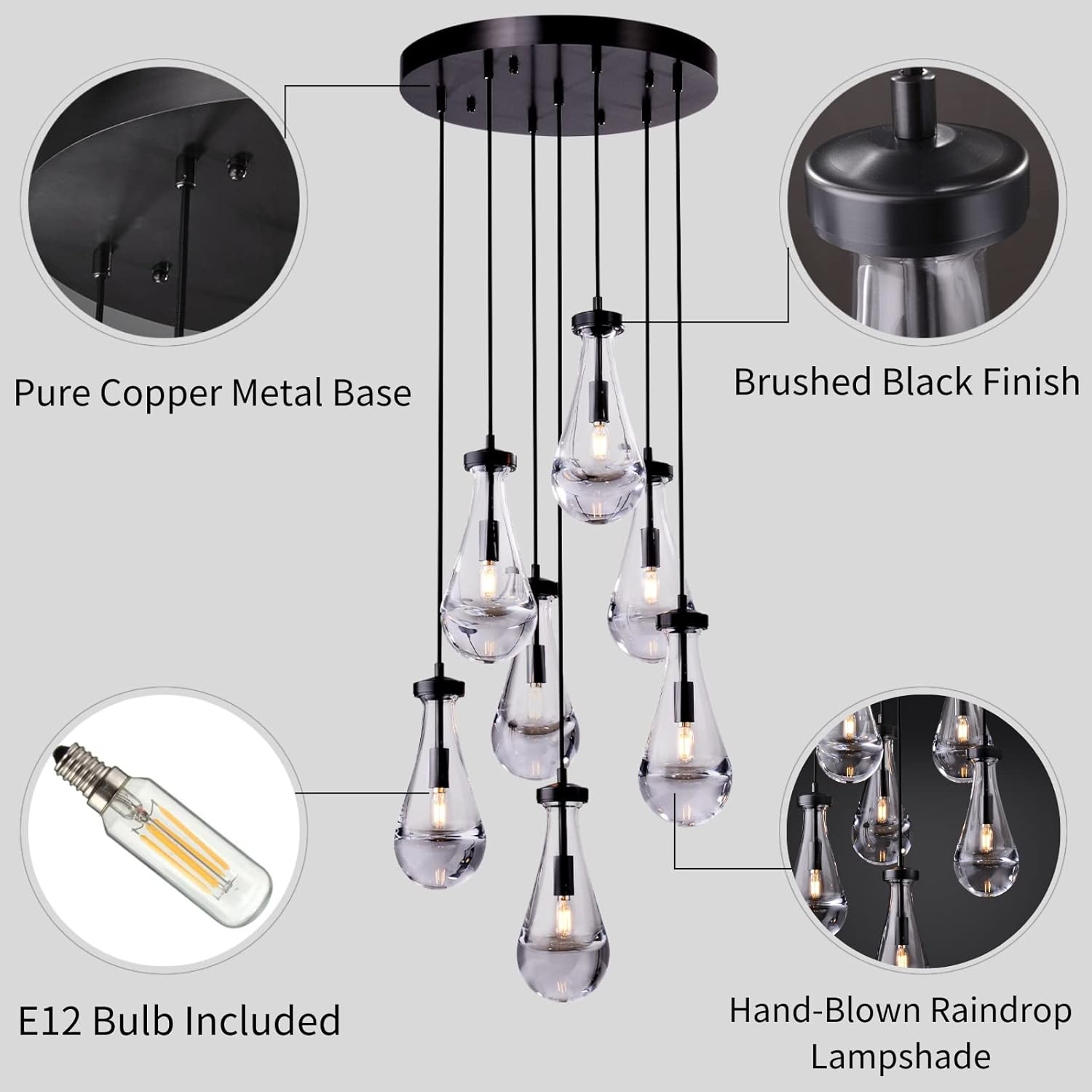 - 【Bulbs Included】Bronze raindrop pendant lights fixture package includes 7* E12 bulbs, which greatly saves you installation time. please use gloves when installing the raindrop glass shade to avoid scratching the shade.