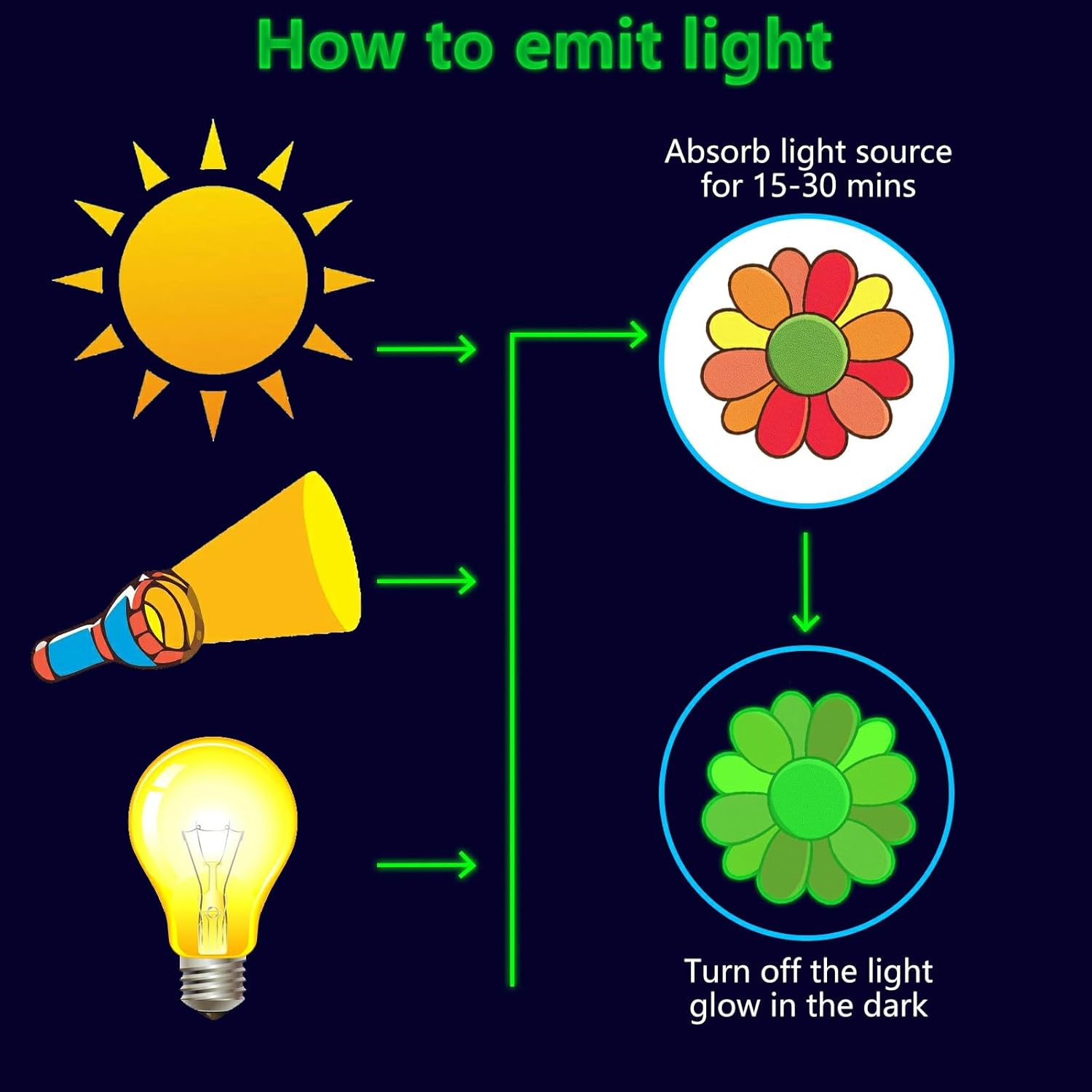 - ✦ Glow Flowers Wall Decals: These glow wall decals for ceiling are made of quality luminous material,they will glow brightly when absorb enough light during the day. You just need to put it under lamplight flashlight ,room light or sunshine for 15 minutes, it will keep glowing for 8-10 hours with a gentle green fluorescent light. Please ensure the light shines on the decals without obstruction, the longer it takes to absorb light, then to light up for up to longer.