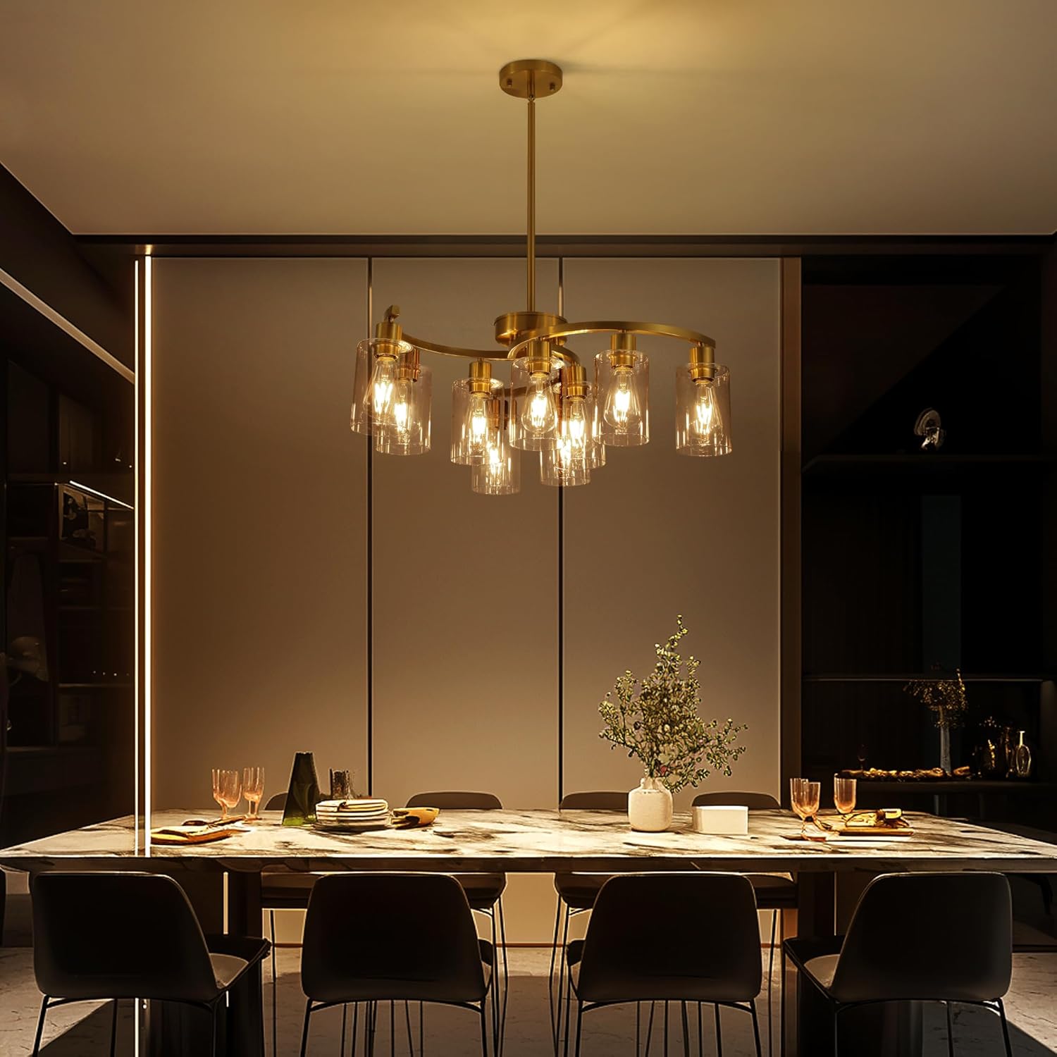 9-Light Gold Glass Chandelier, Adjustable Height Dining Room Light Fixtures Over Table, Contemporary Hanging Chandelier for Kitchen Island Living Room Foyer Office, Clear Glass Shade