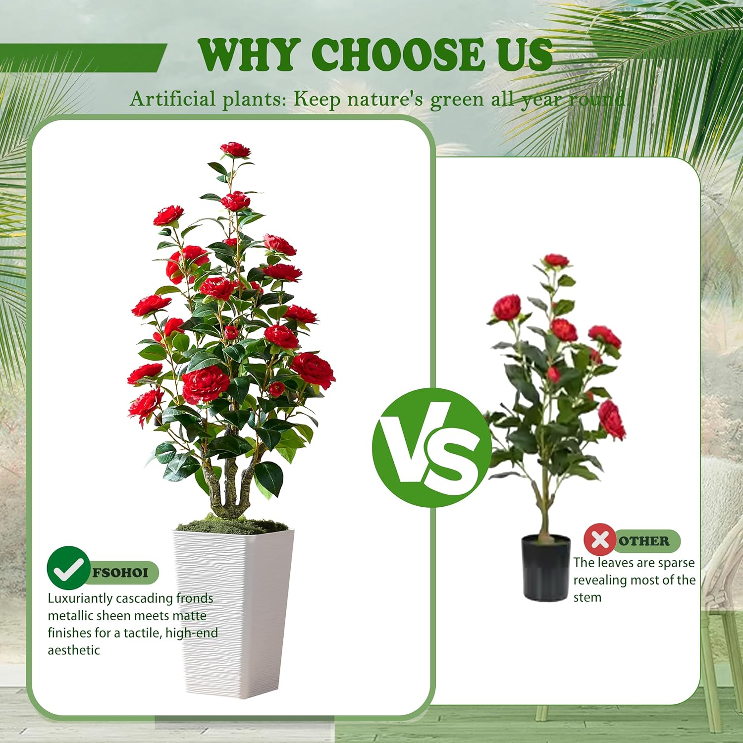 - ๐ธ Lifelike Camellia Trees: FSOHOI fake trees are meticulously crafted to mimic the appearance of real plants, being as close to the genuine article as possible; Especially referring to the blooming camellias, which are lifelike and have dense foliage; they appear vibrant and perfectly adorn your life. Artificial tree is made from high-quality materials, making it safe and realistic