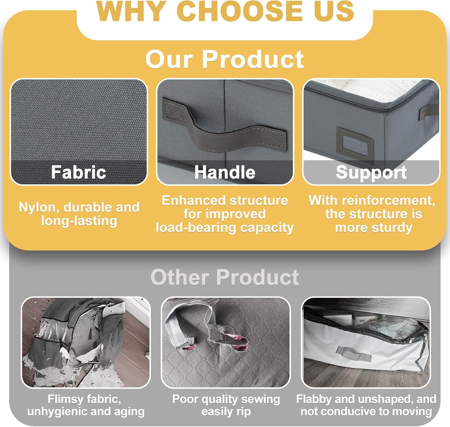 - STURDY AND DURABLE: Our under-bed storage container is incredibly durable. It is primarily made of robust Oxford fabric and reinforced with a thickened PVC film, offering double protection for long-lasting use. The double-stitched PU leather handles and the high-quality stainless steel zipper both contribute to its excellent durability. With thickened cardboard inserted into the sides and bottom, it maintain its shape even when partially filled, keeping your space neat and tidy