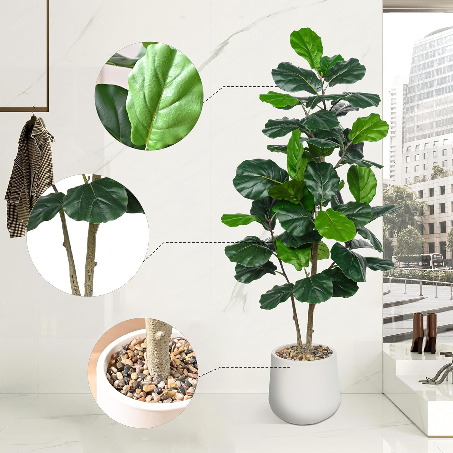 - Ultra-Realistic Indoor Artificial Tree: This 5ft/60-inch artificial fiddle leaf fig tree features full, lush foliage and a tall, elegant silhouette, making it a stunning statement piece that enhances any decor. Artificial fig tree comes with a modern white pot (8.7"H x 9"W) and pebbles, seamlessly fitting styles from minimalist to bohemian