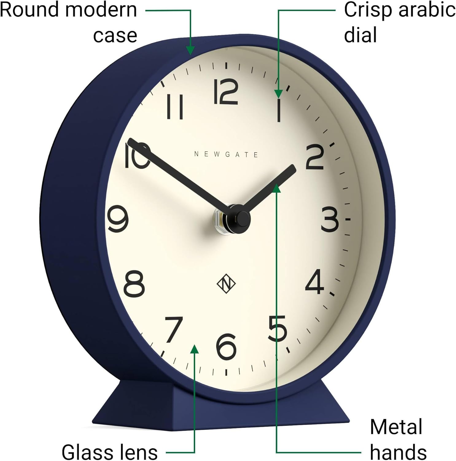 NEWGATE® M Mantel Echo Desk Clock | Modern Round Design | Navy Blue | Easy to Read Numbers | Contemporary Style for Desk, Table, Shelf or Bedside