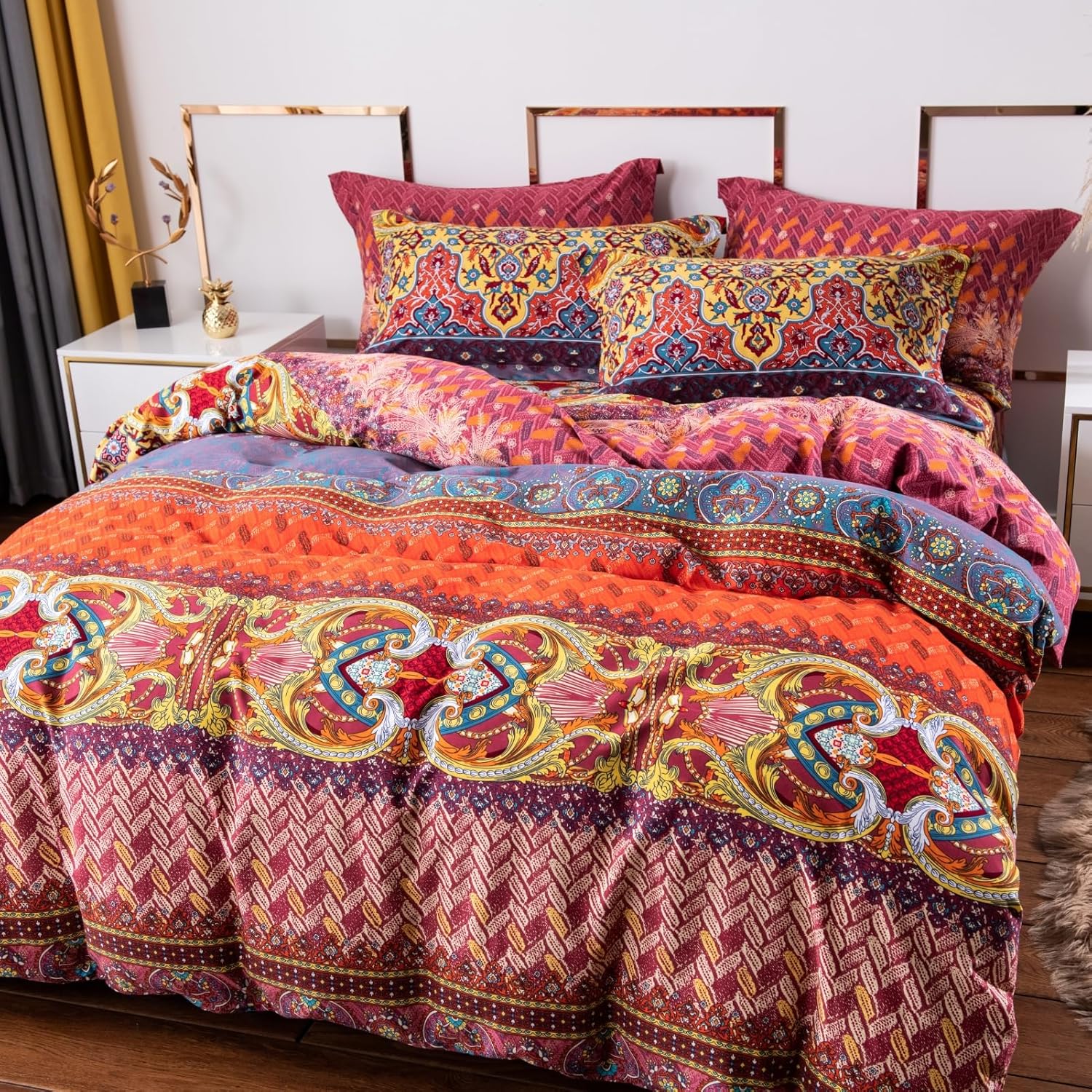 ABREEZE Bohemian Duvet Cover Set Colorful Orange Boho Retro Bedding Set Damask Paisley Cotton Duvet Cover Tribal Reversible Bedding Exotic Style Comforter Cover 3-Piece Queen