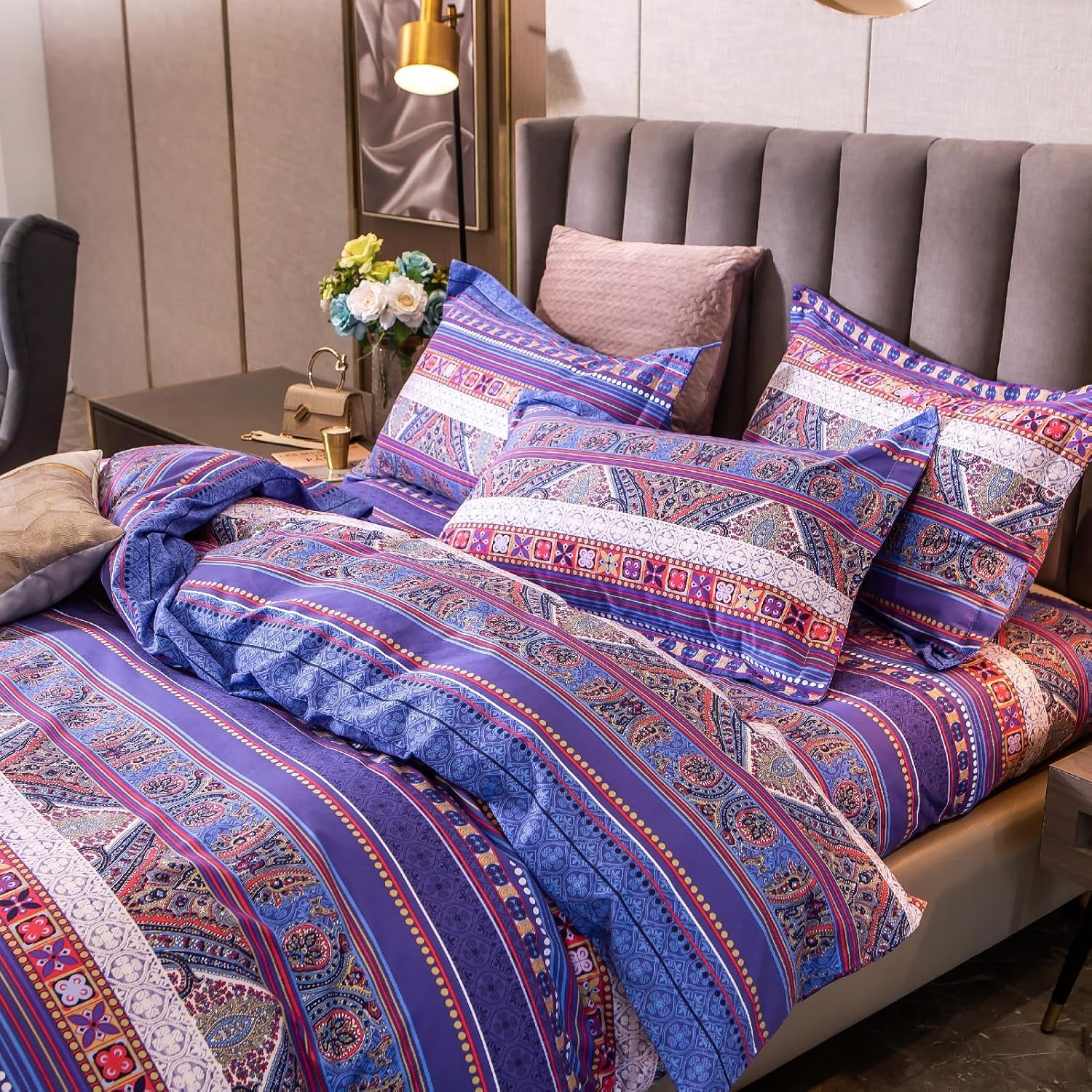 ABREEZE Bohemian Vintage Queen Size Floral Cotton Bedding Set 3Pcs Duvet Cover Set Boho Purple Paisley 100% Egyptian Brushed Cotton Reversible Home Bedding Collection