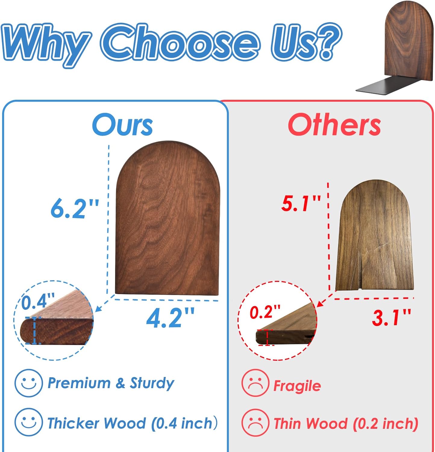 - Natural Black Walnut Craftsmanship: Crafted from black walnut with unique natural grain patternsāno veneers or synthetic dyes, each pair is unique. Thicker wooden bookends are more durable and resistant to drops, adding the breath of nature for your desk.