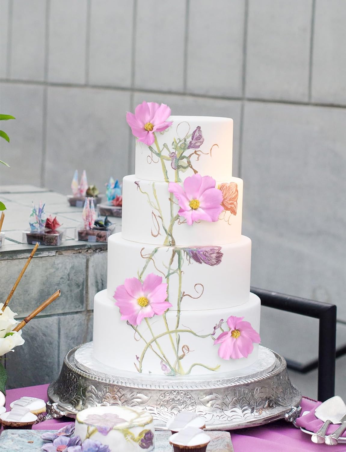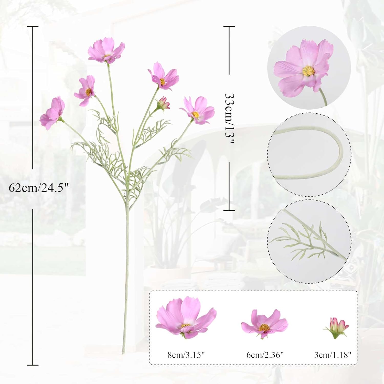 - Quantity and Size: Packed 5PCS light purple cosmos artificial flowers. Total approx. 24.5inches/62cm height, bigger daisy flower 3.15โ/8cm, smaller 2.36'' /6cm, cosmos bud 1.18โ/3cm. Each daisy flowers artificial wildflowers set with 4 large flower heads, 1 small and 1 bud, total with 30 flowers heads. The long stem artificial flowers is ideal for your tall flowers for floor vase floral arrangements