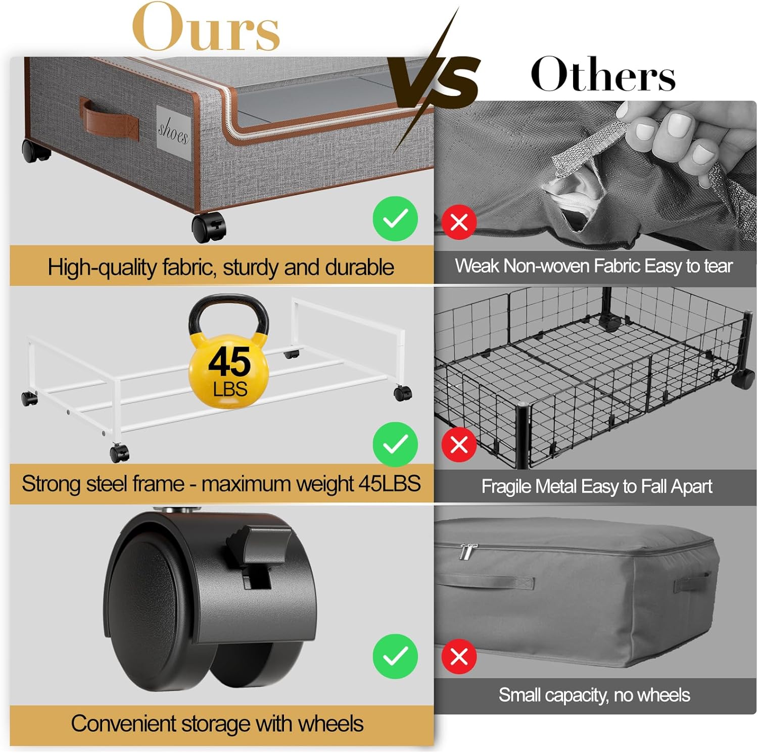 - 【360° Rotating Silent Wheels】Tired of lugging heavy storage boxes around? This under bed rolling storage solution features four smooth-gliding 360° rotating wheels, two of which include a locking function. Simply engage the locks with a gentle press to keep the unit securely in place when needed. It effortlessly glides across both hard floors and carpets, even when fully loaded