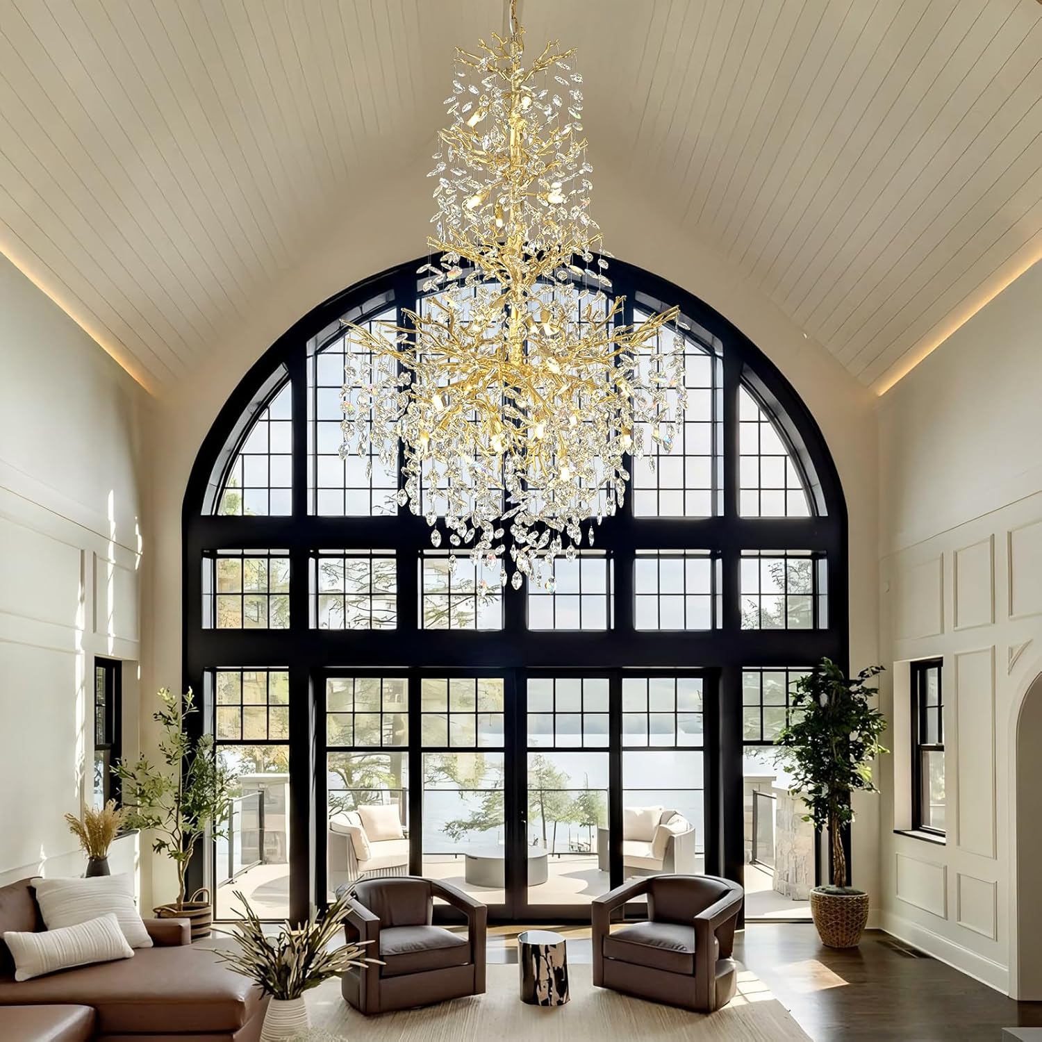 - Contemporary Classic Design: This high-ceiling chandelier is inspired by nature, with a silhouette that echoes the elegance of lush tree branches. Crafted from premium K9 crystal, its unique design makes it a stunning focal point—perfect for elevating any staircase or grand interior space.