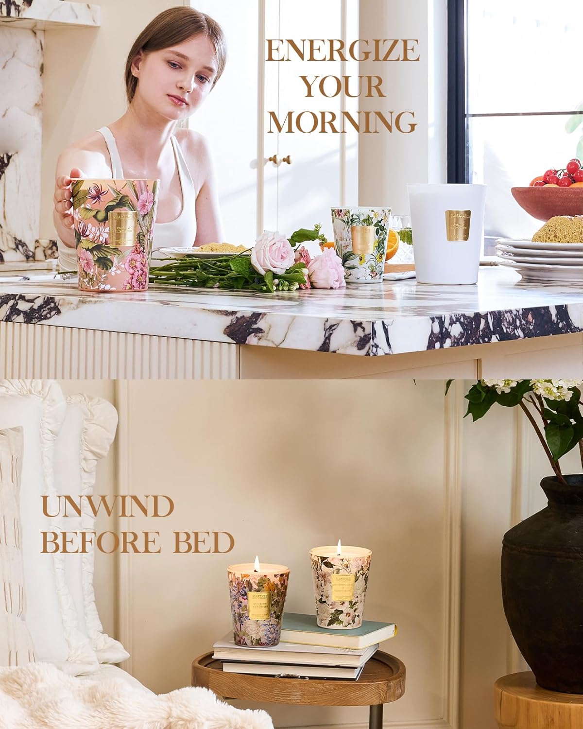 - Aesthetic Jar Candles - The exquisite flower pattern design brings a touch of nature's charm. With the elegant gold sticker, it creates a luxurious and sophisticated look. This makes our candle an ideal choice for home decoration, as it effortlessly enhances the aesthetic appeal of any living space