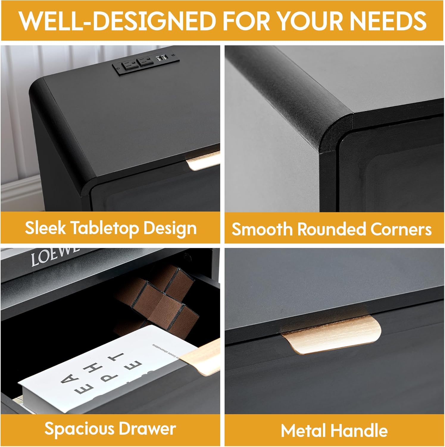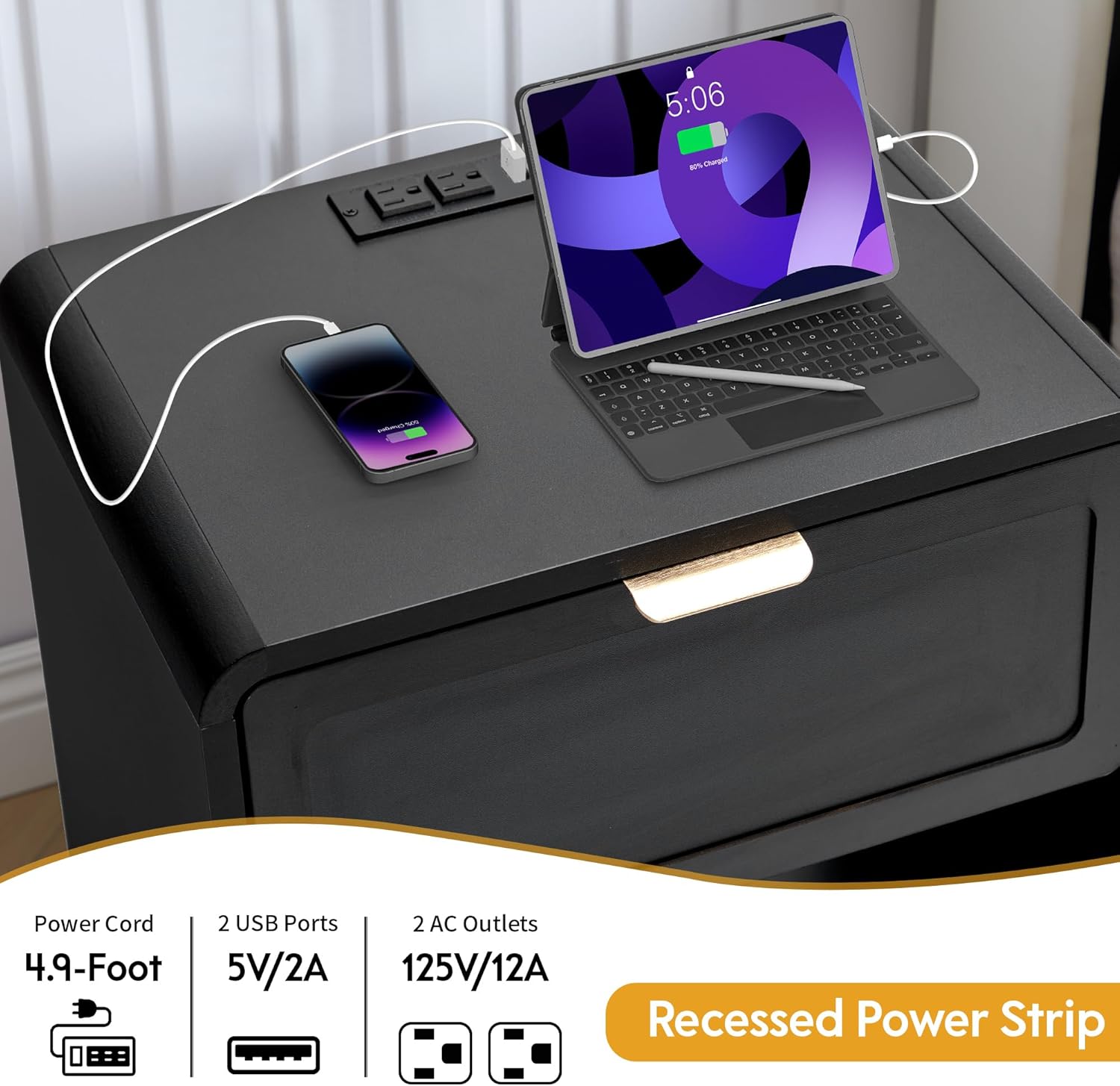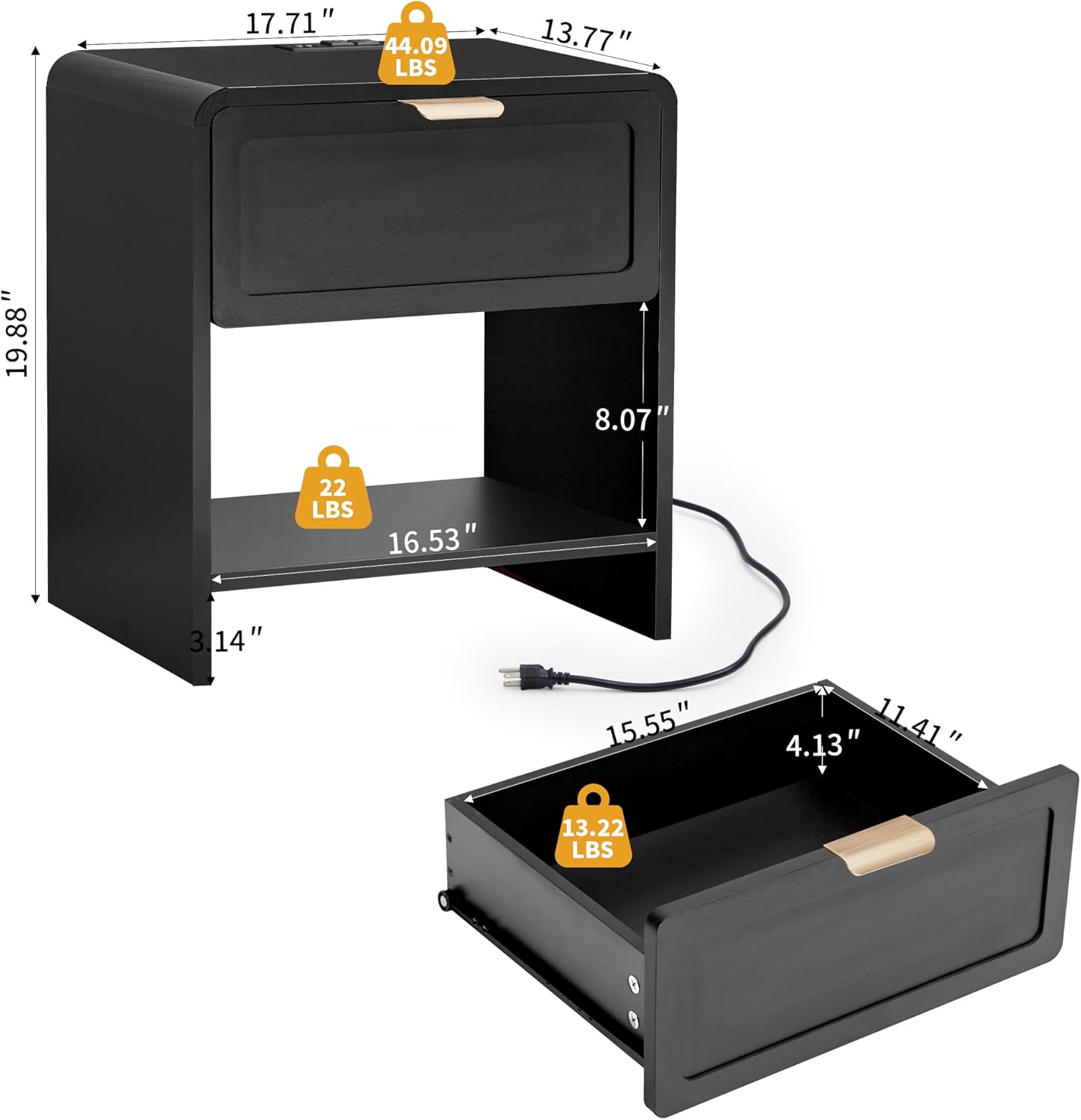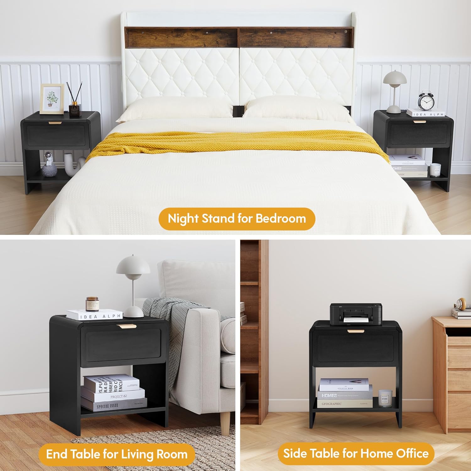 LEVNARY Nightstand with Charging Station, Mid-Century Modern Bedside Table with Curved Top Corners and Storage Drawer, Wooden End Table for Farmhouse Bedroom Living Room (1, Black)