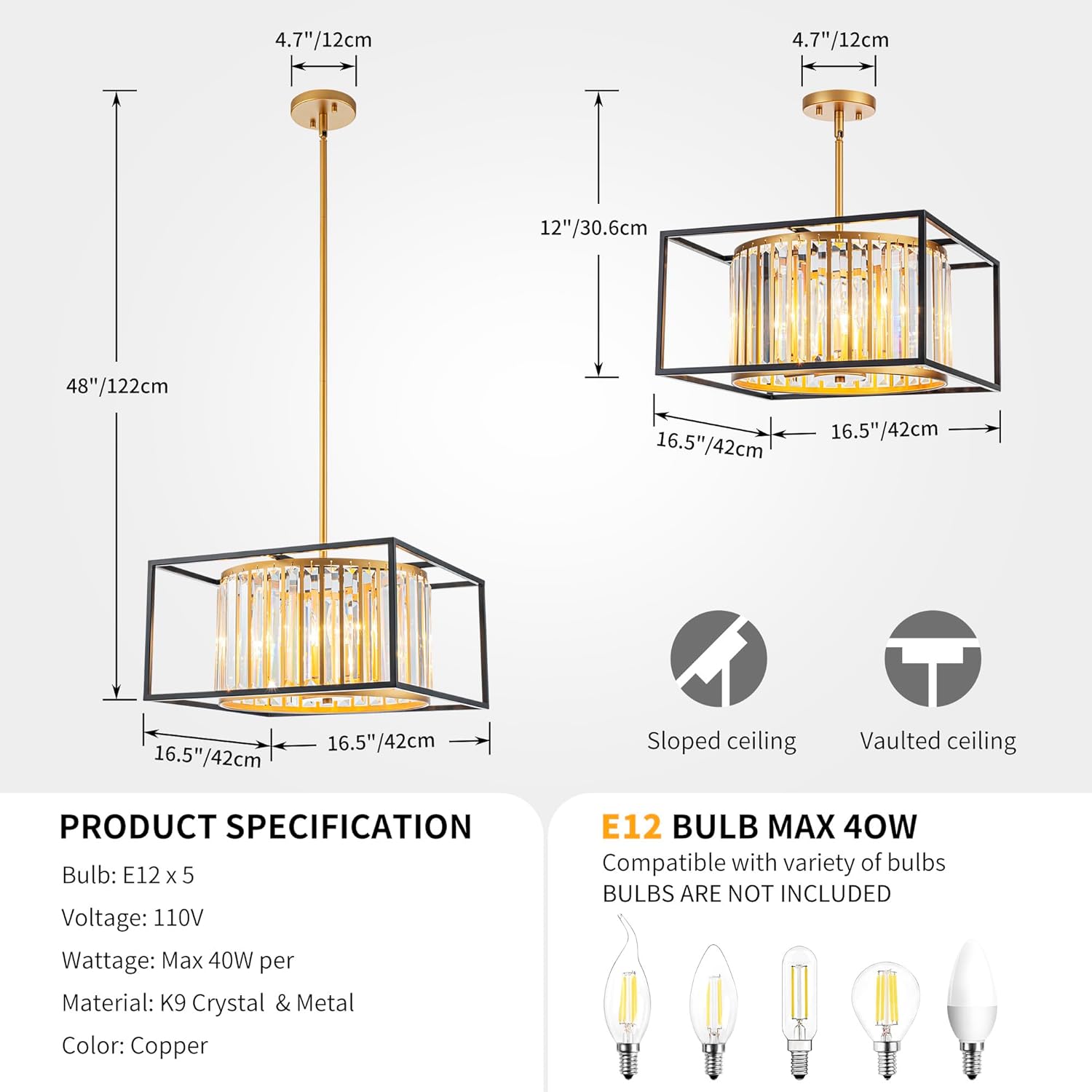 - Adjustable Dimension: With a diameter of 16.5 inches (42cm) and an adjustable height ranging from 12 inches (30.6cm) to 48 inches (122cm), it adapts to various ceiling heights as a pendant light. It fits for installation on both sloped and vaulted ceilings, offering flexible adaptability to diverse room layouts.