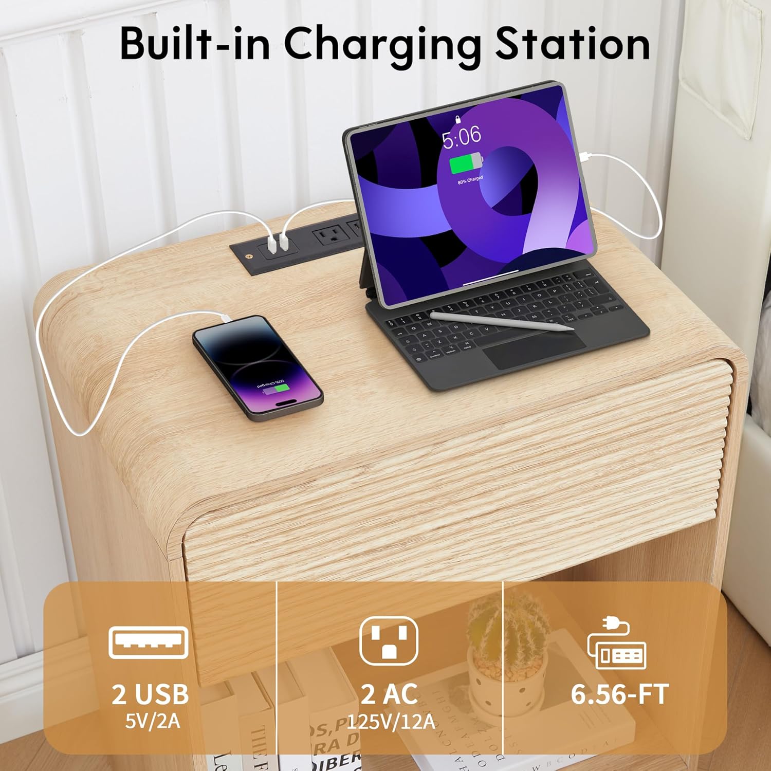 Fluted Nightstand Set of 2 with Charging Station, Modern Bed Side Table End Table with Drawer Storage, Large Wooden Night Stands Bedside for Bedroom Living Room Sofa Office, Natural 2 Sets