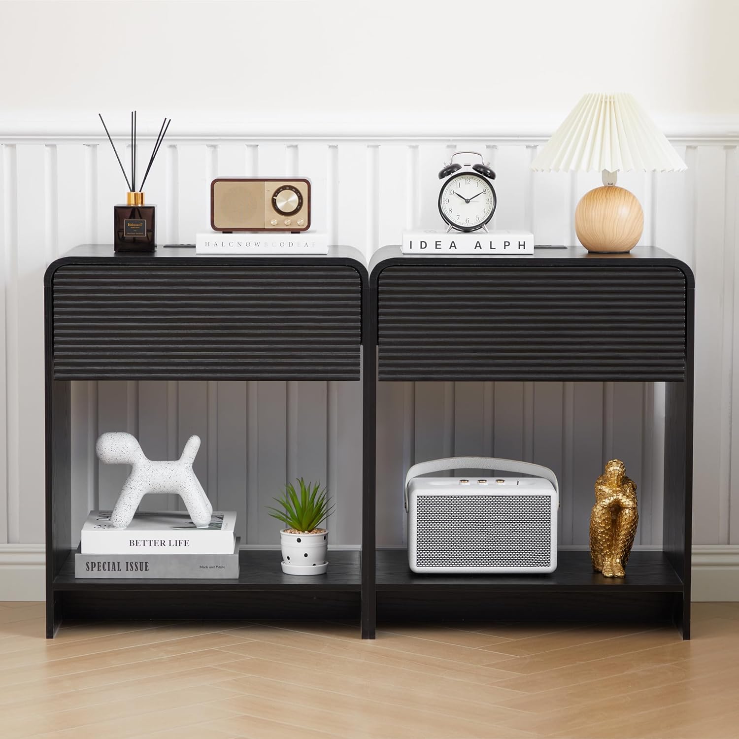 Fluted Nightstand Set of 2 with Charging Station, Modern Bed Side Table End Table with Drawer Storage, Large Wooden Night Stands Bedside for Bedroom Living Room Sofa Office, Black 2 Sets
