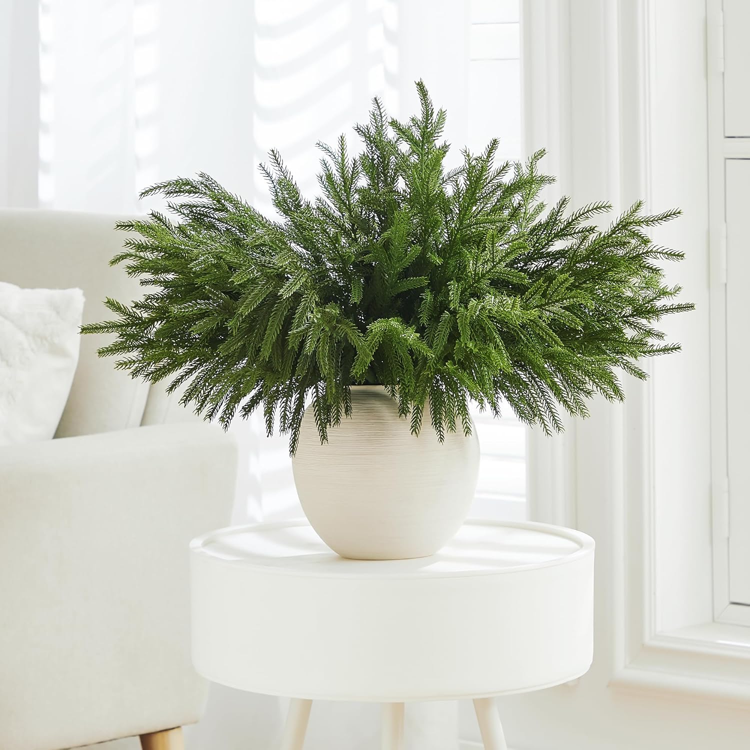 - Quantity and Size: With 16pcs Norfolk pine stems included in each bulk purchase, you have sufficient artificial pine branches to create stunning arrangements throughout your home. Each Norfolk Pine Branch is about 18 Inches and made of soft plastic which make these Norfolk pine stems hung down naturally. It is perfect Christmas greenery for vase filler and Christmas centerpieces for tables.